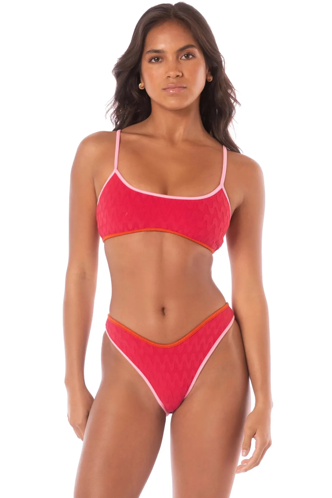 Lane bralette bikini top reverses from a wavy textured solid color to a vibrant tropical print. Offers adjustable straps and removable cups.