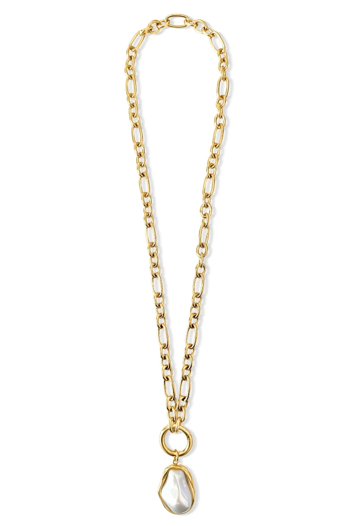 Langston necklace features hypoallergenic gold plated stainless steel, a faux pearl pendant, and a clasp closure.