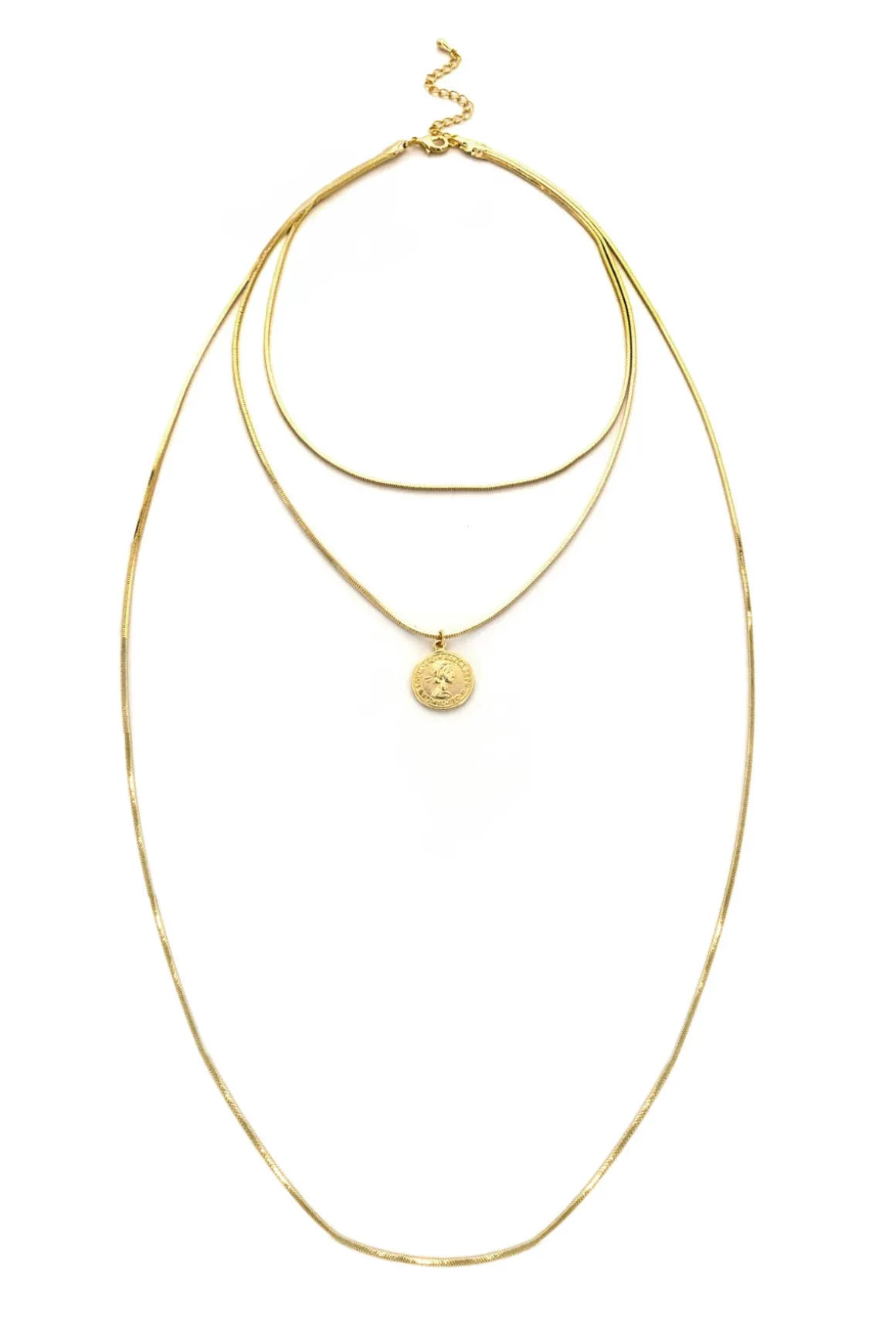 Necklace features three layered box chains and a center token accent bead. Offers a lobster clasp closure.