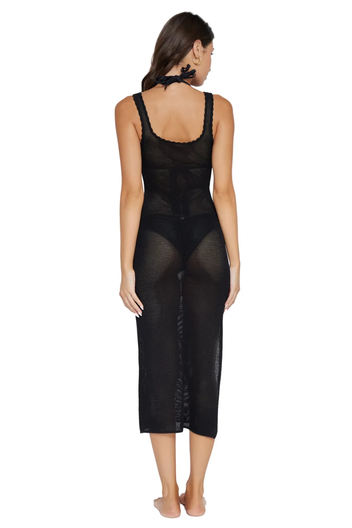 Maxi dress features crochet knit with scalloped trim, a scooped neckline, and a thigh-high side slit.