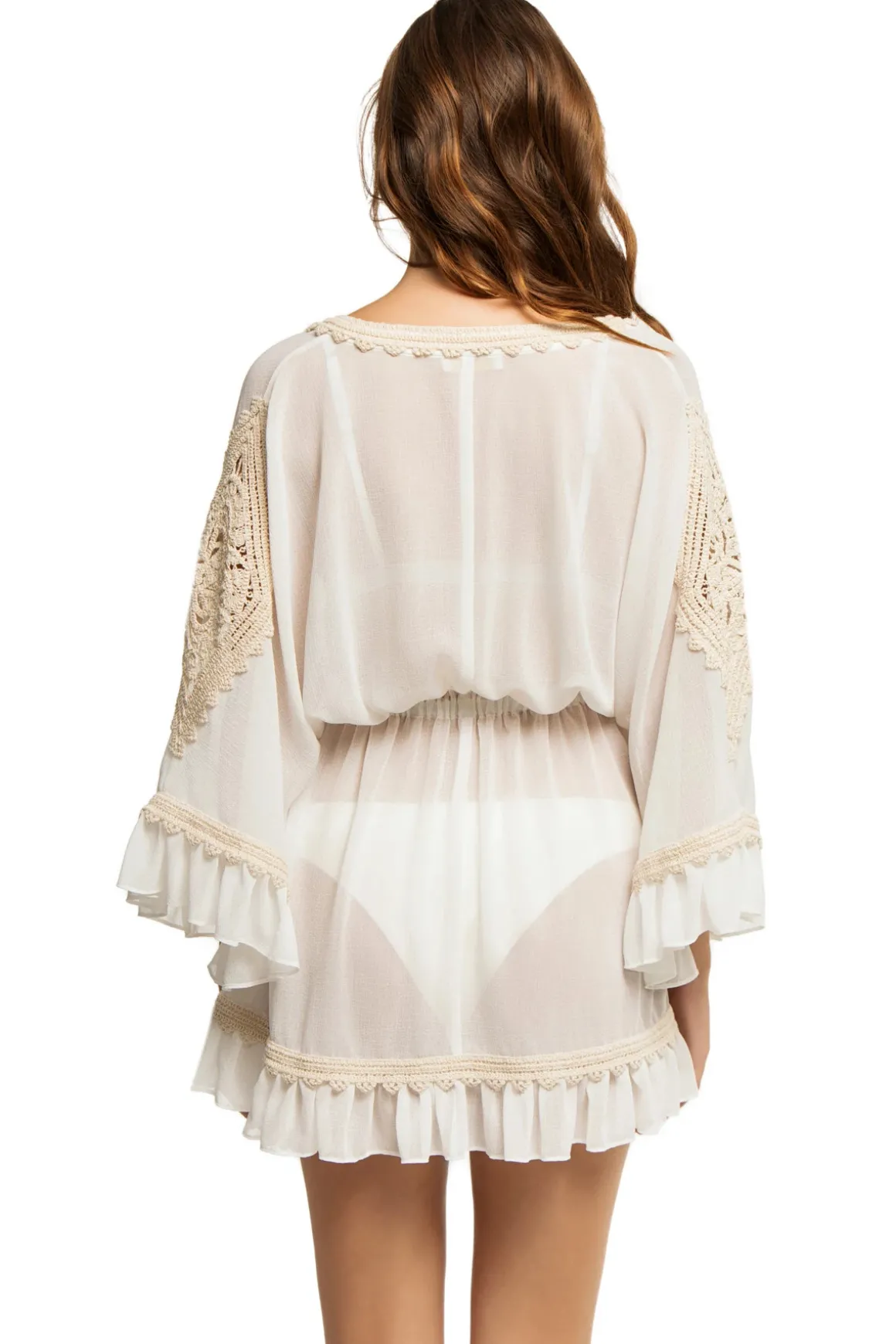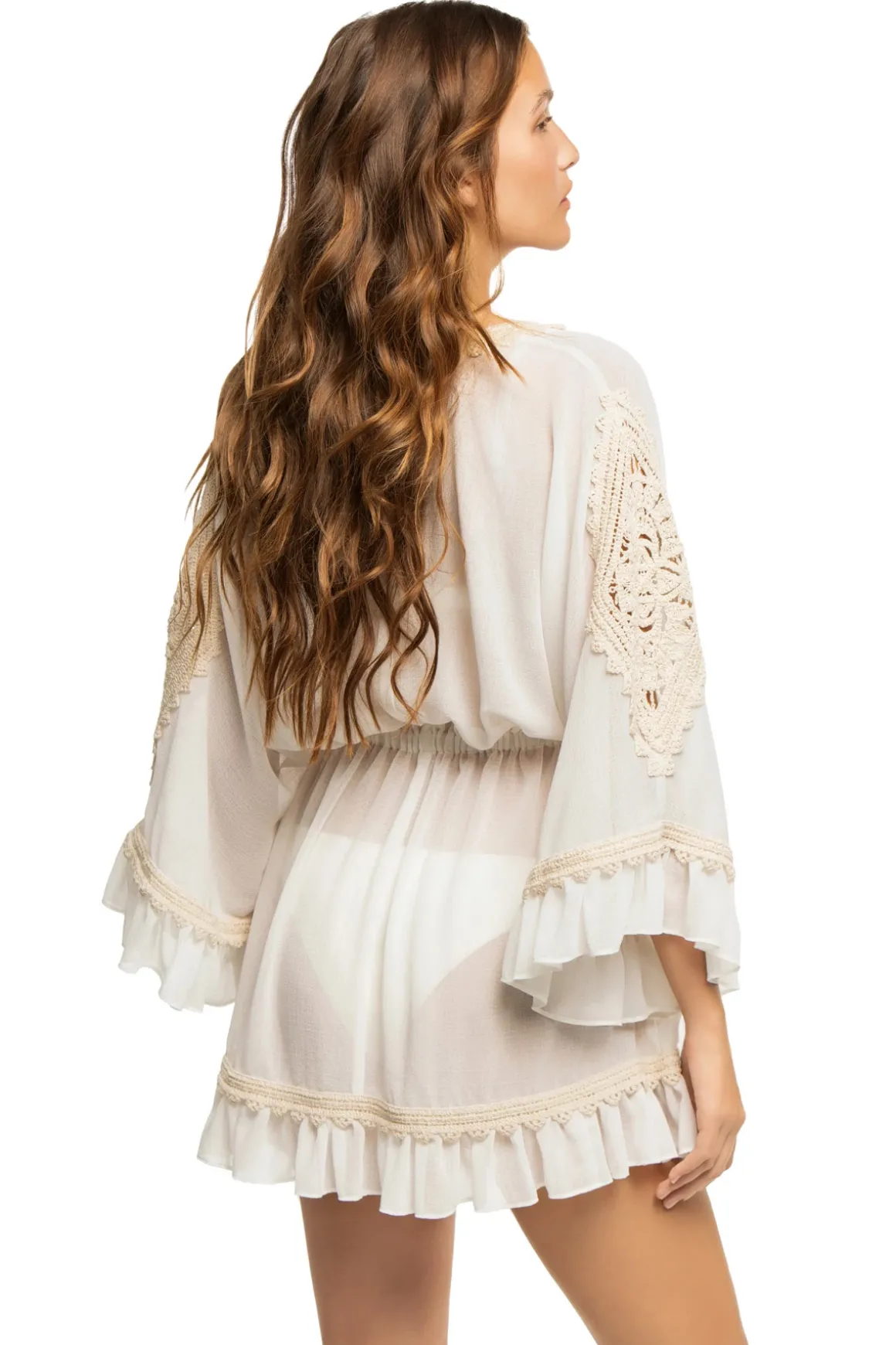 Libbie Kimono features charming crochet details, long sleeves with ruffle accents, and a tie waist closure for added style and comfort.