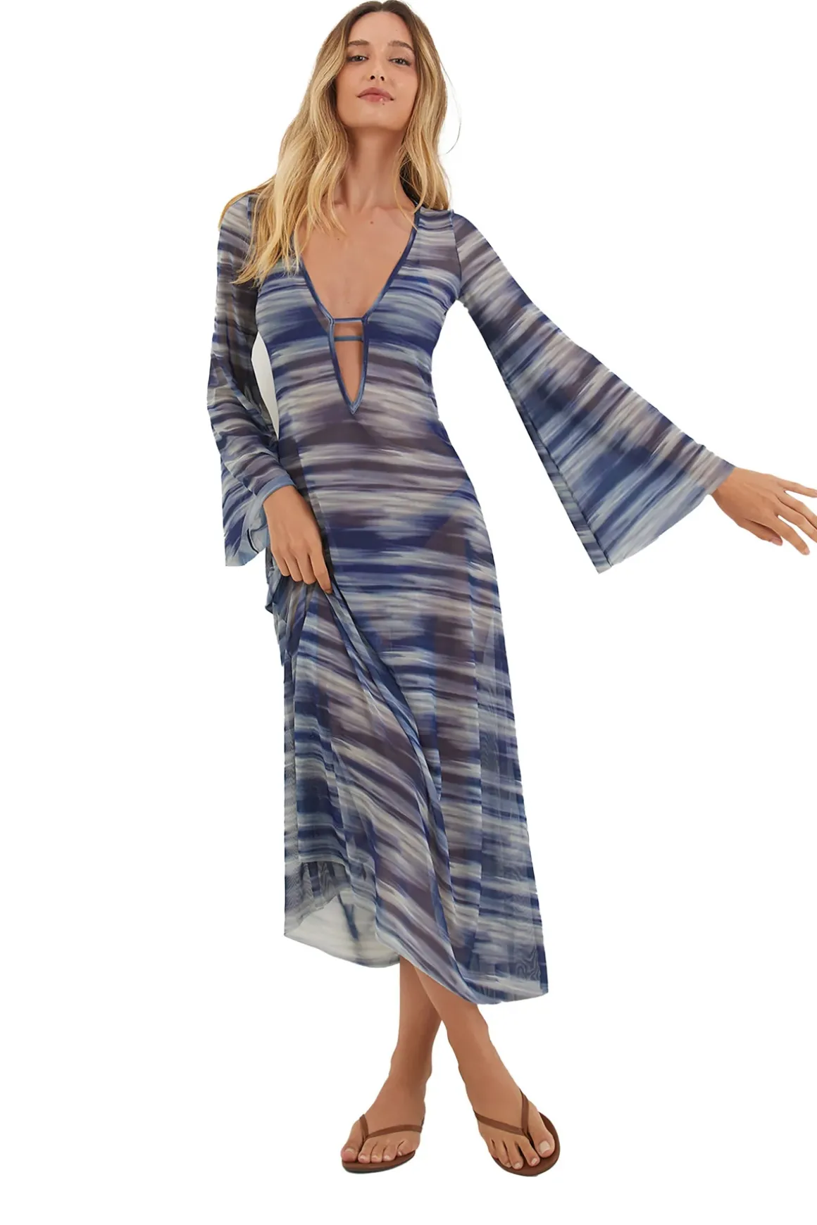 Lidi cover up dress features soft mesh fabric, plunging neckline with keyhole detail, and flared trumpet long sleeves.