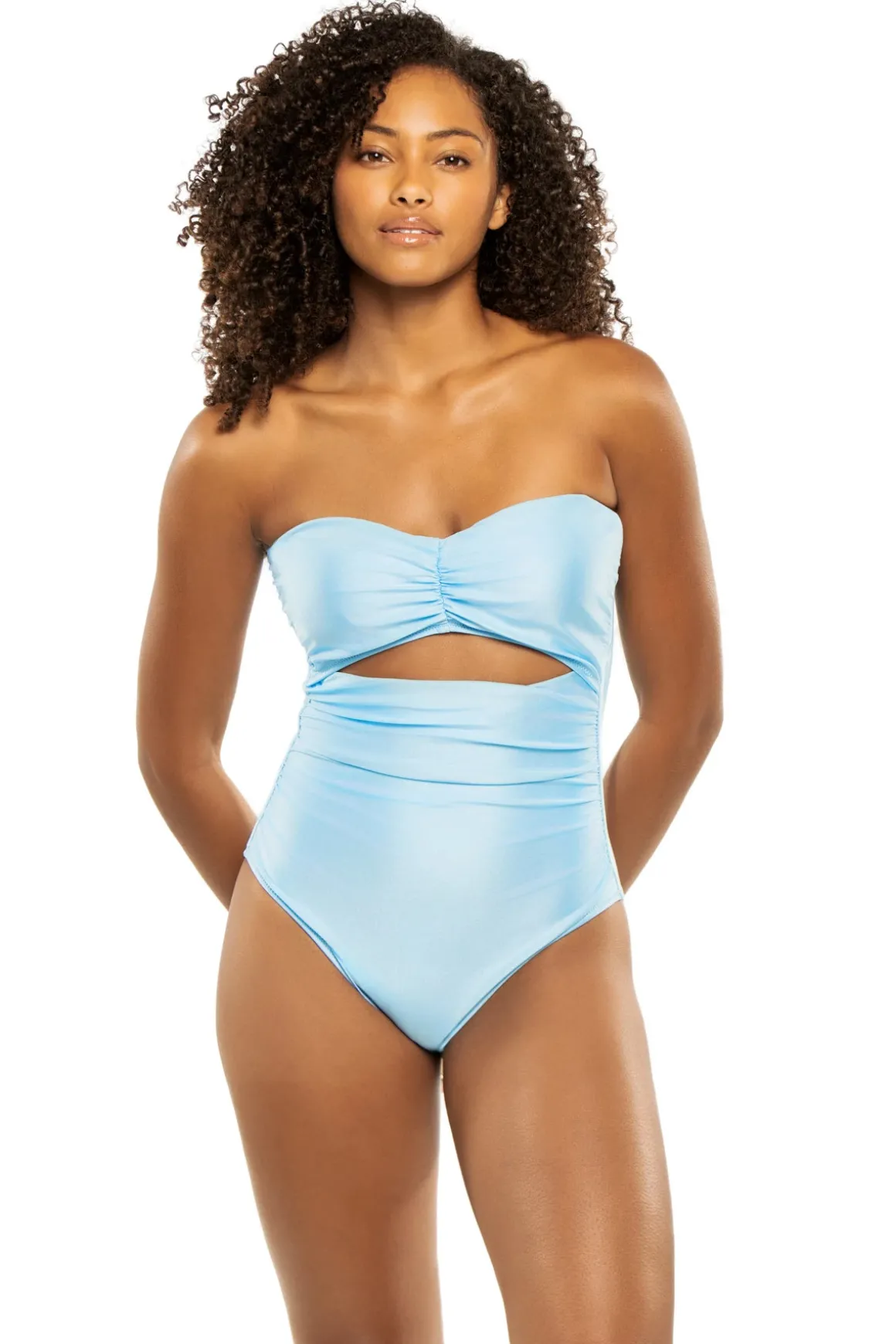Lily one piece swimsuit features bandeau neckline, small cutout under the bust, and shirred bodice. Offers removable straps, removable cups, and provides moderate coverage.