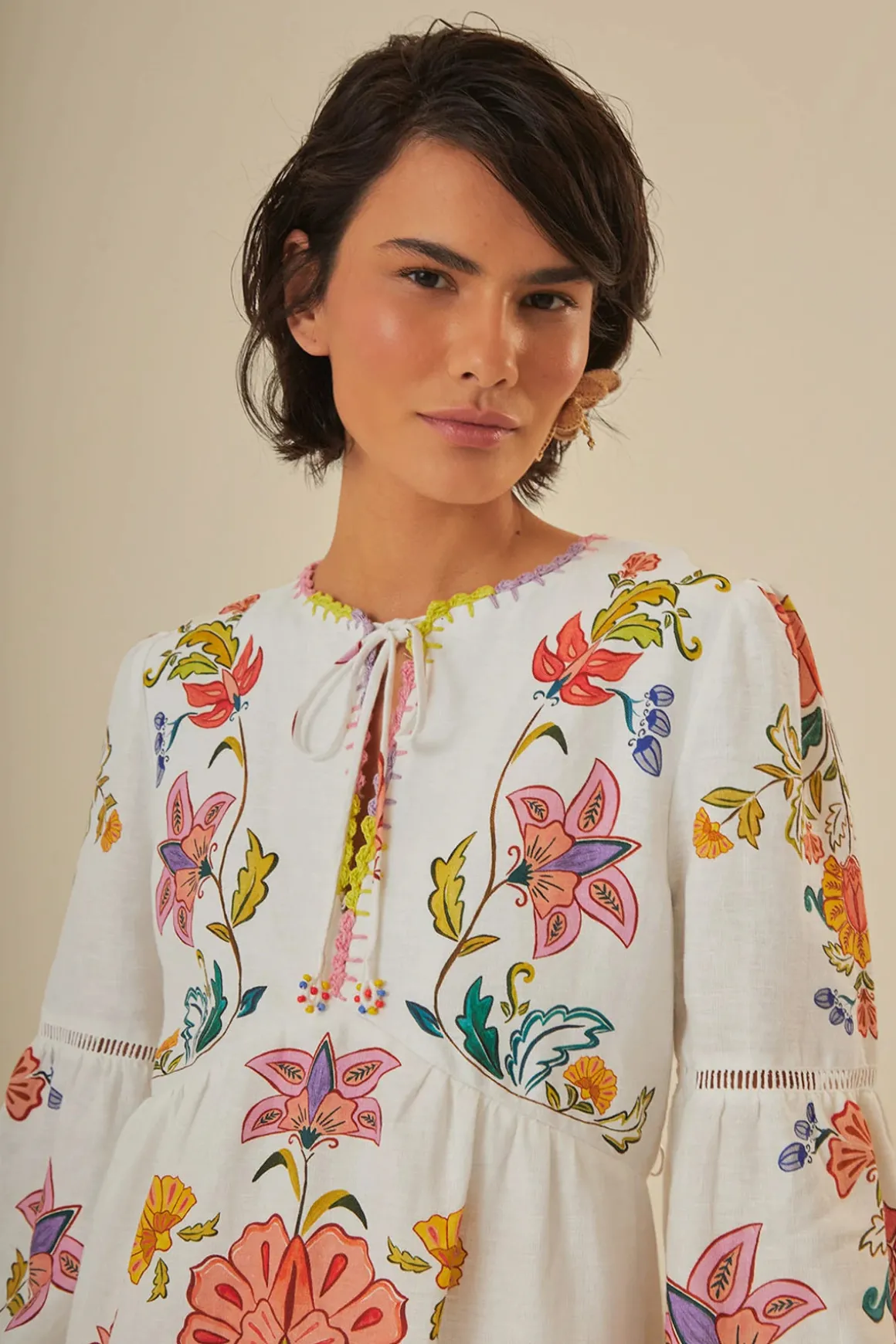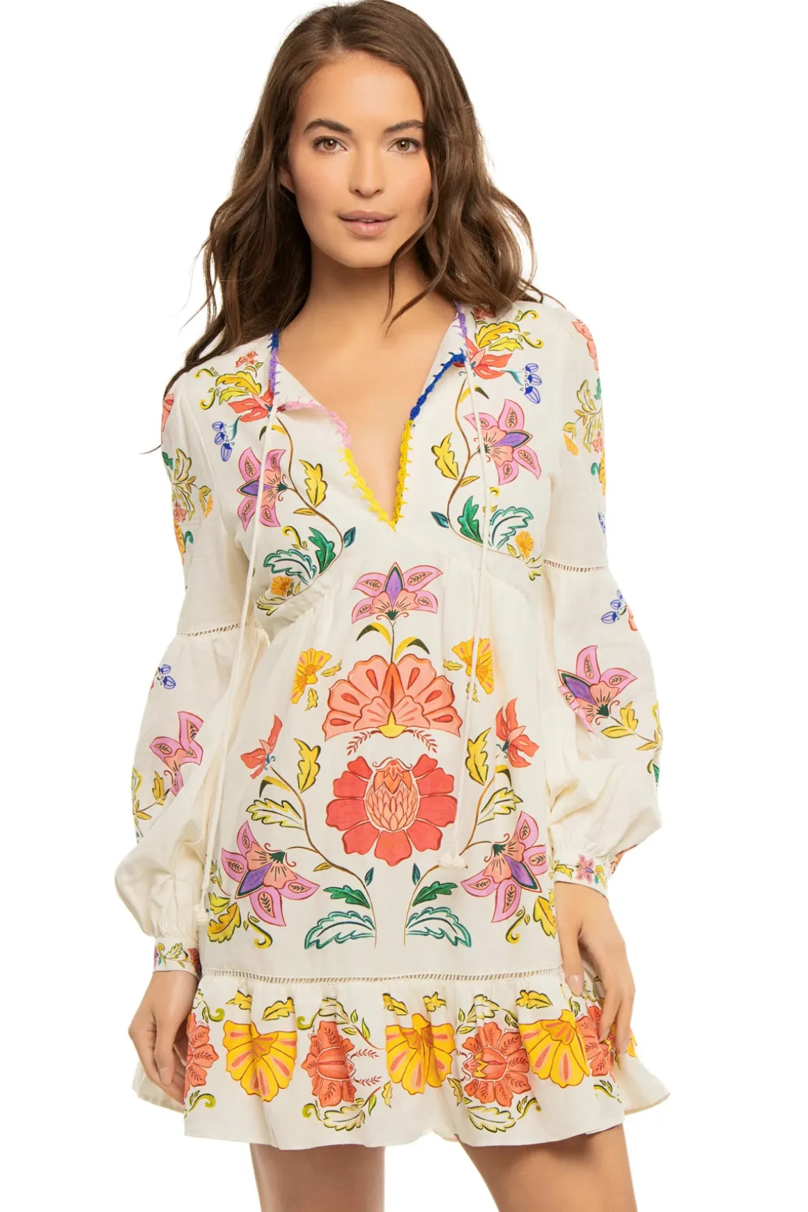 Mini dress features floral detailed fabric with ladder inset detailing and offers long sleeves and tie neckline.