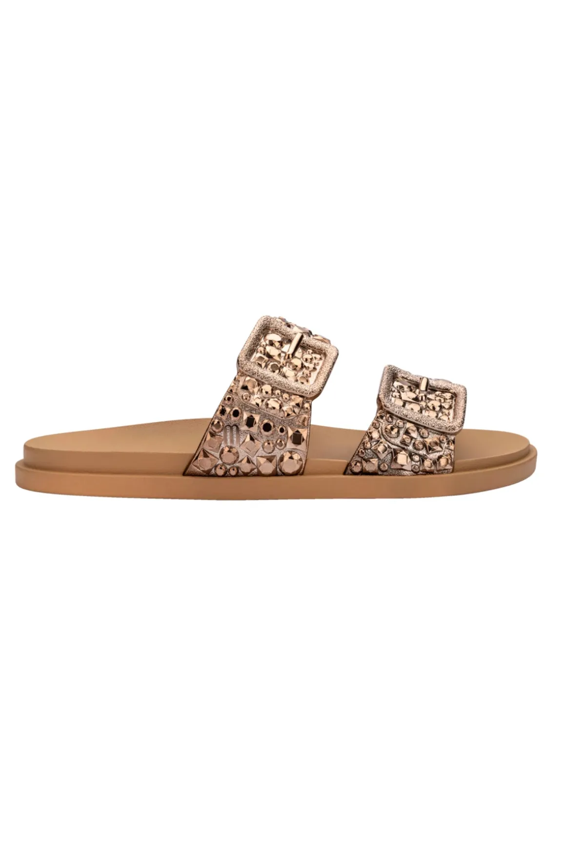 Lust slides features an ultra-lightweight design, chrome-finish PVC upper and bold, non-adjustable buckles for a standout, stylish look.