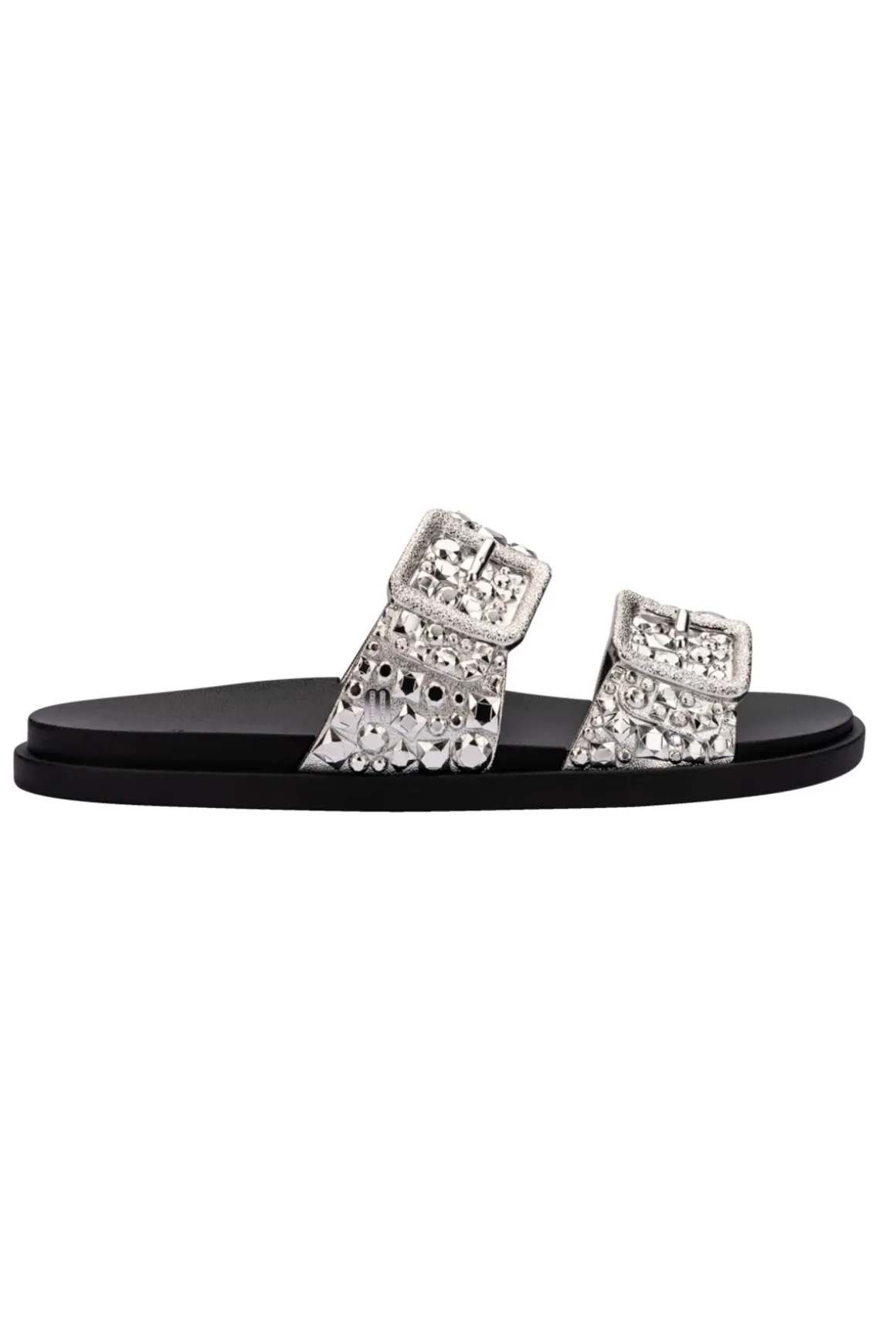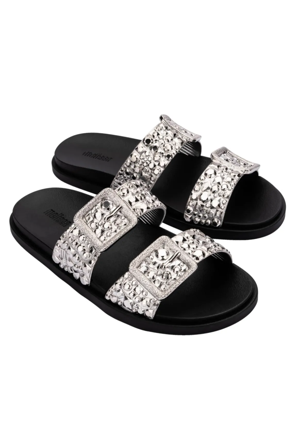 Lust slides features an ultra-lightweight design, chrome-finish PVC upper and bold, non-adjustable buckles for a standout, stylish look.