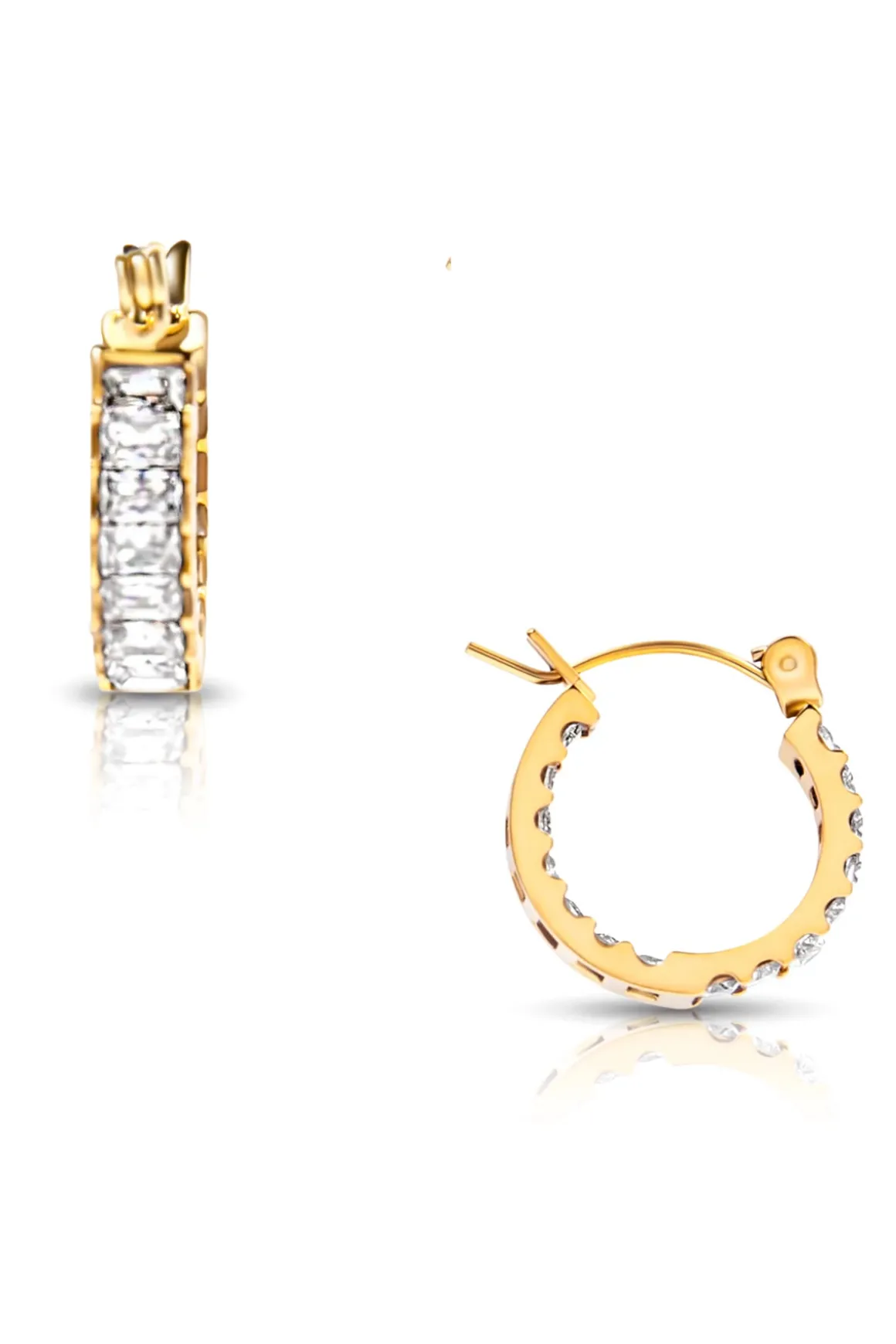 Lyndsay Huggie hoop earrings are water-resistant, made from gold-plated stainless steel, and feature cubic zirconia. Offers snap back closure.
