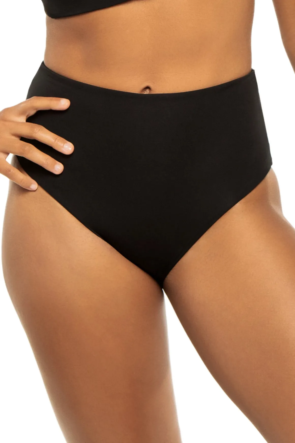 Merly bikini set features an asymmetrical top with puffy detail around the neckline and a back tie closure. A high waist bottom offers moderate coverage. Resistant to UV, chlorine, and sunscreen.