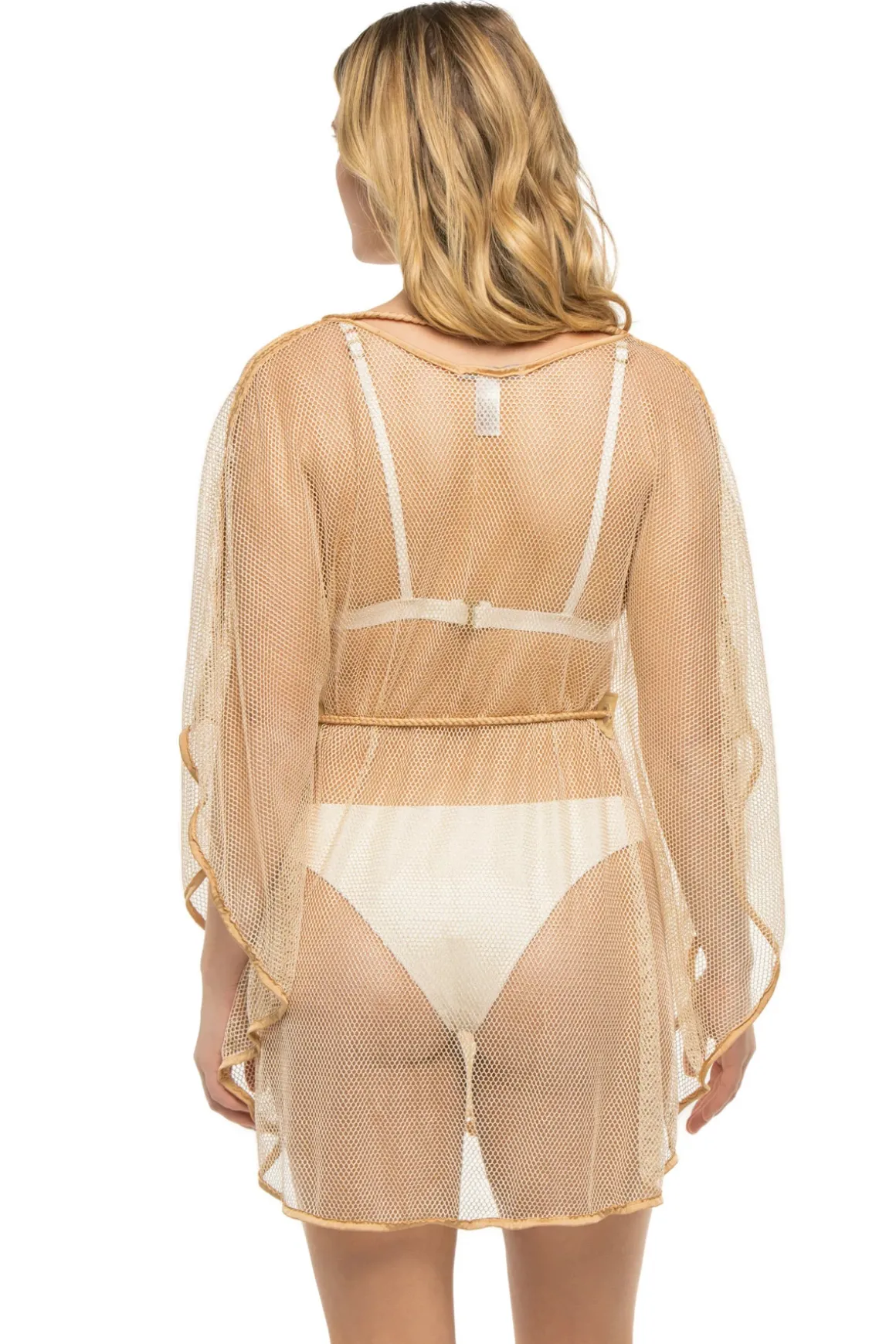 Mesh caftan features gold metallic fabric, a plunging neckline and butterfly sleeves. Offers an adjustable braided belt with 18k gold plated tassels.