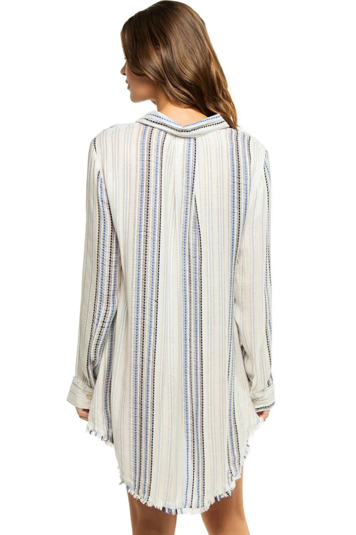 Tunic features a metallic stripe printed fabrication with a button down front, long, relaxed fitting sleeves, a collared neckline, and a playful fringe hem.