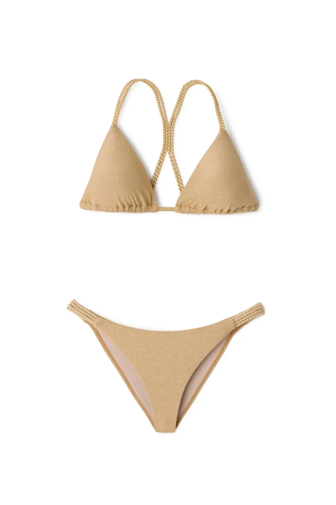 Shimmery triangle top features rope detailed racerback straps.Offers removable soft cups and a tie back closure.