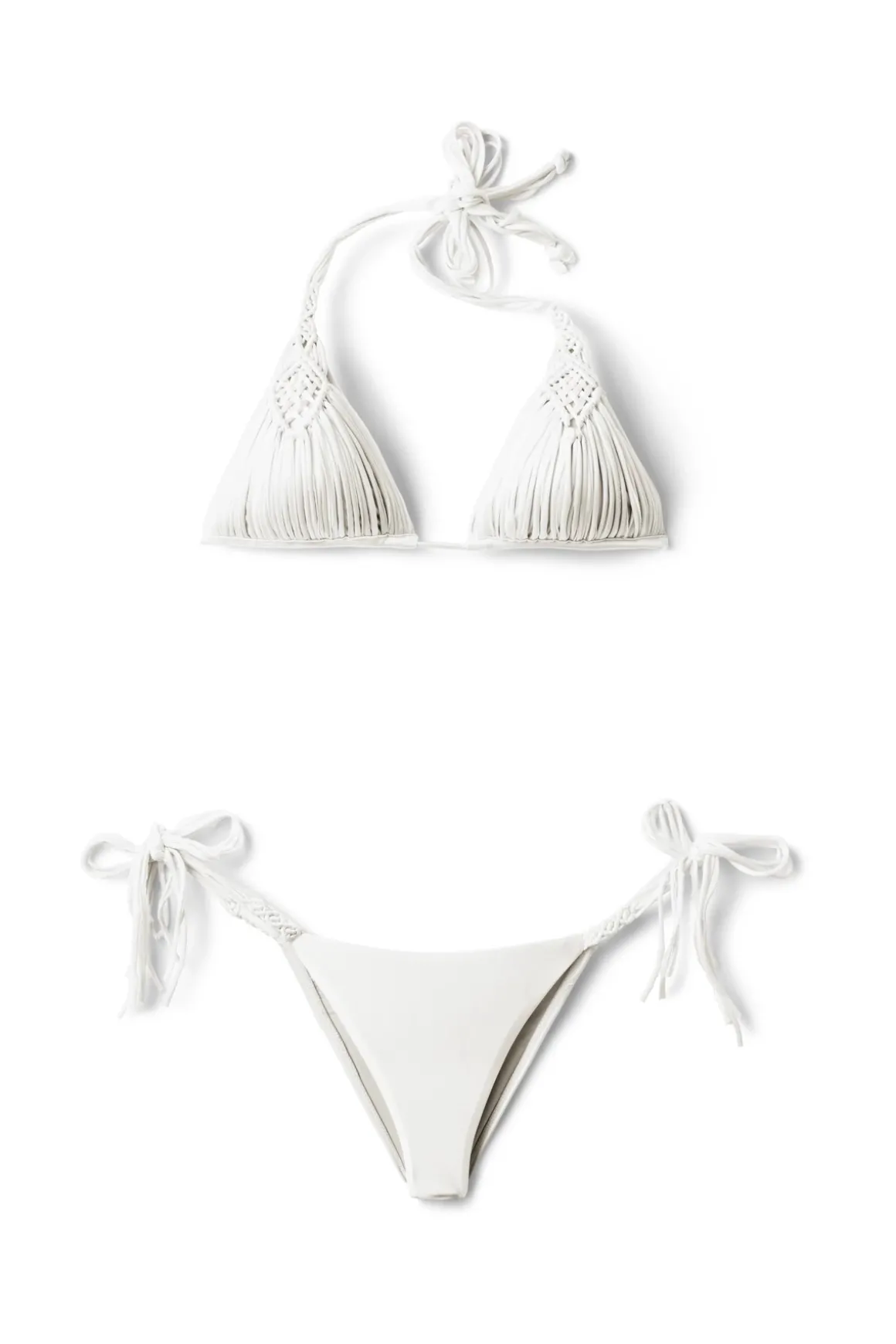 Mila sliding triangle bikini top features hand detailed macramé. Offers removable padding and ties at neck and back.