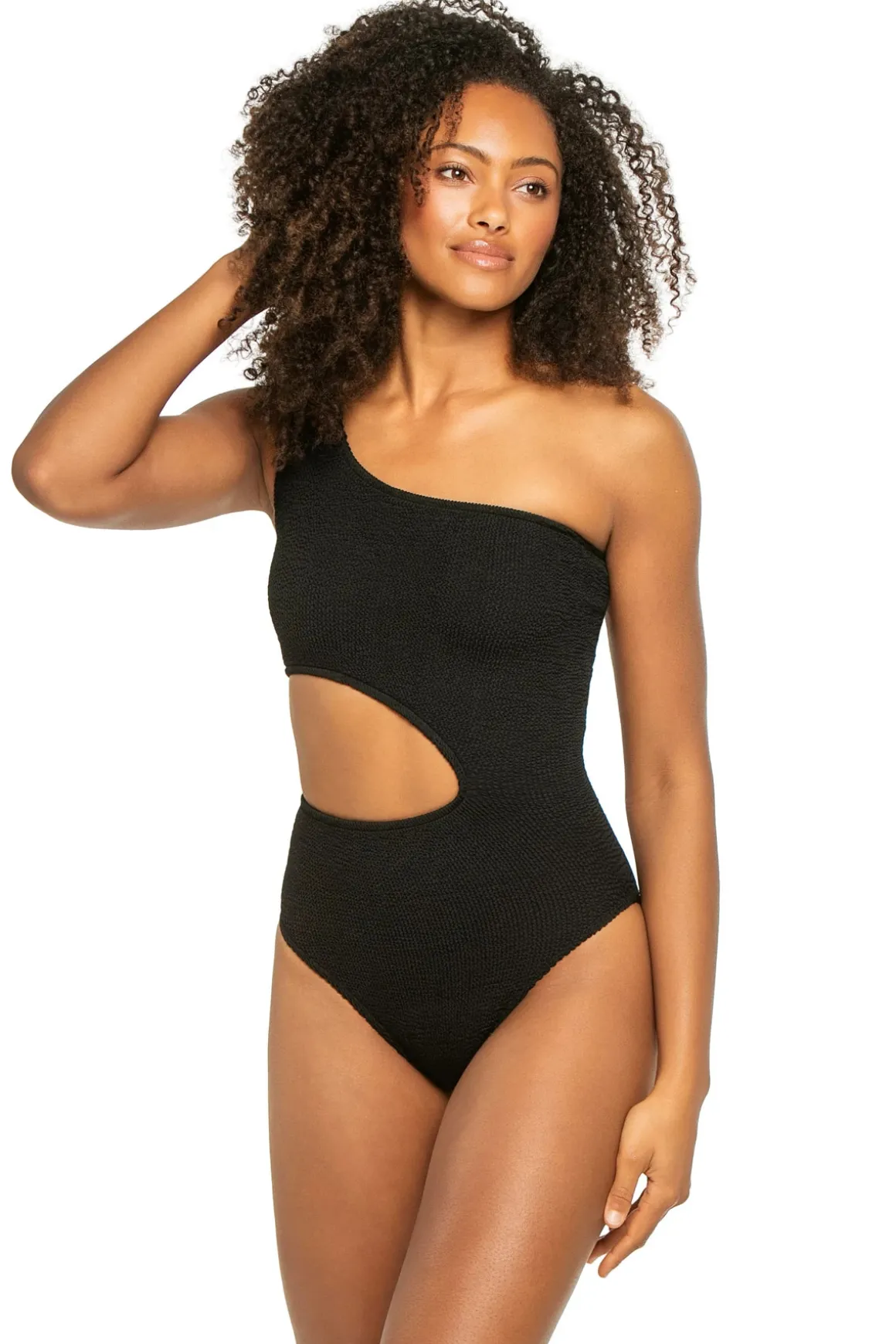 One piece swimsuit features crinkle stretch fabric, one shoulder design, side cut-out and cheeky bottom coverage.