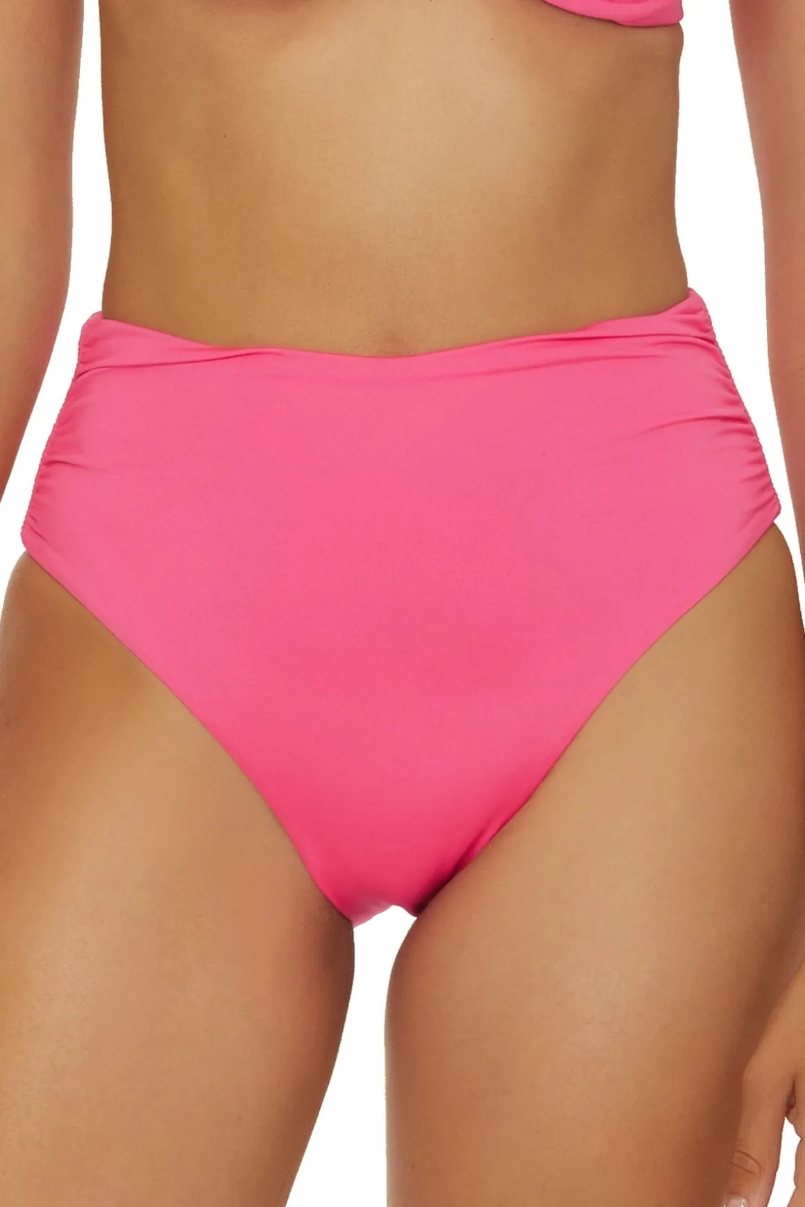 Bikini bottom features a high waistband, shirring and moderate bottom coverage.