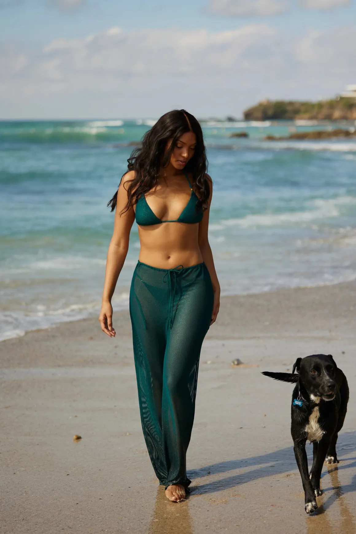 Shimmery mesh pants offer a simple, breezy silhouette and a tie waist .
