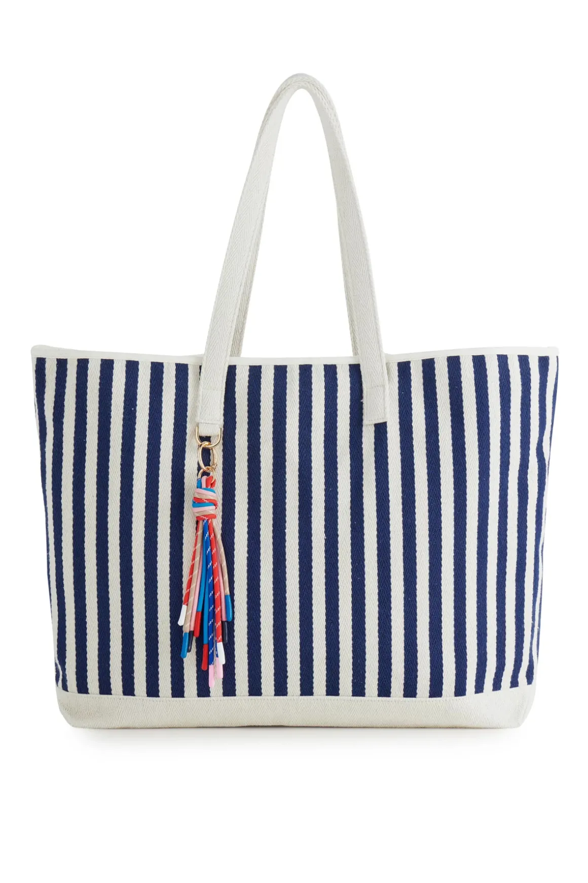 Morgan tote features a striped design and double shoulder straps adorned with a multicolored tassel detail.