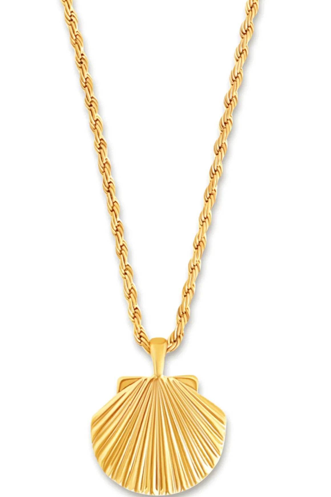 Natalia necklace is water resistant, made from gold plated stainless steel and features a large shell pendant. Offers a lobster clasp closure with an extender.