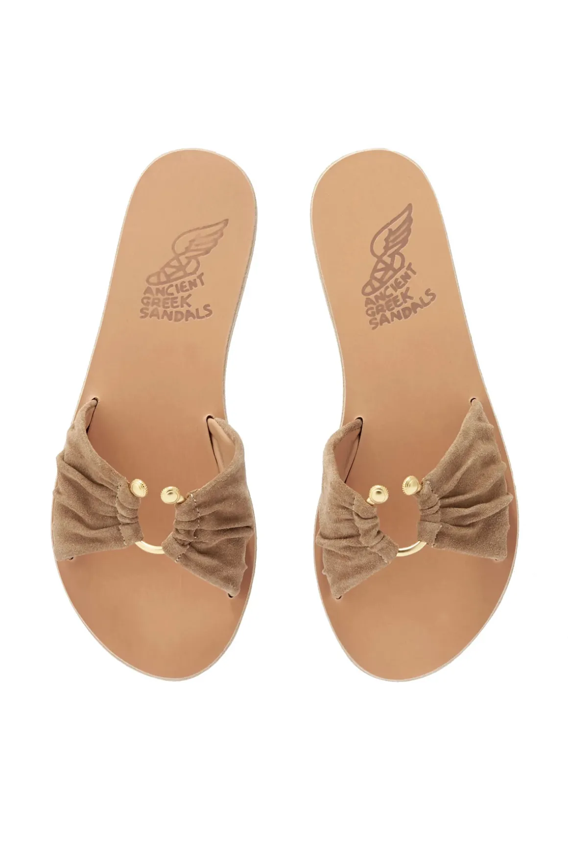 Nektaria slides feature a wide suede strap with gold hardware detail.