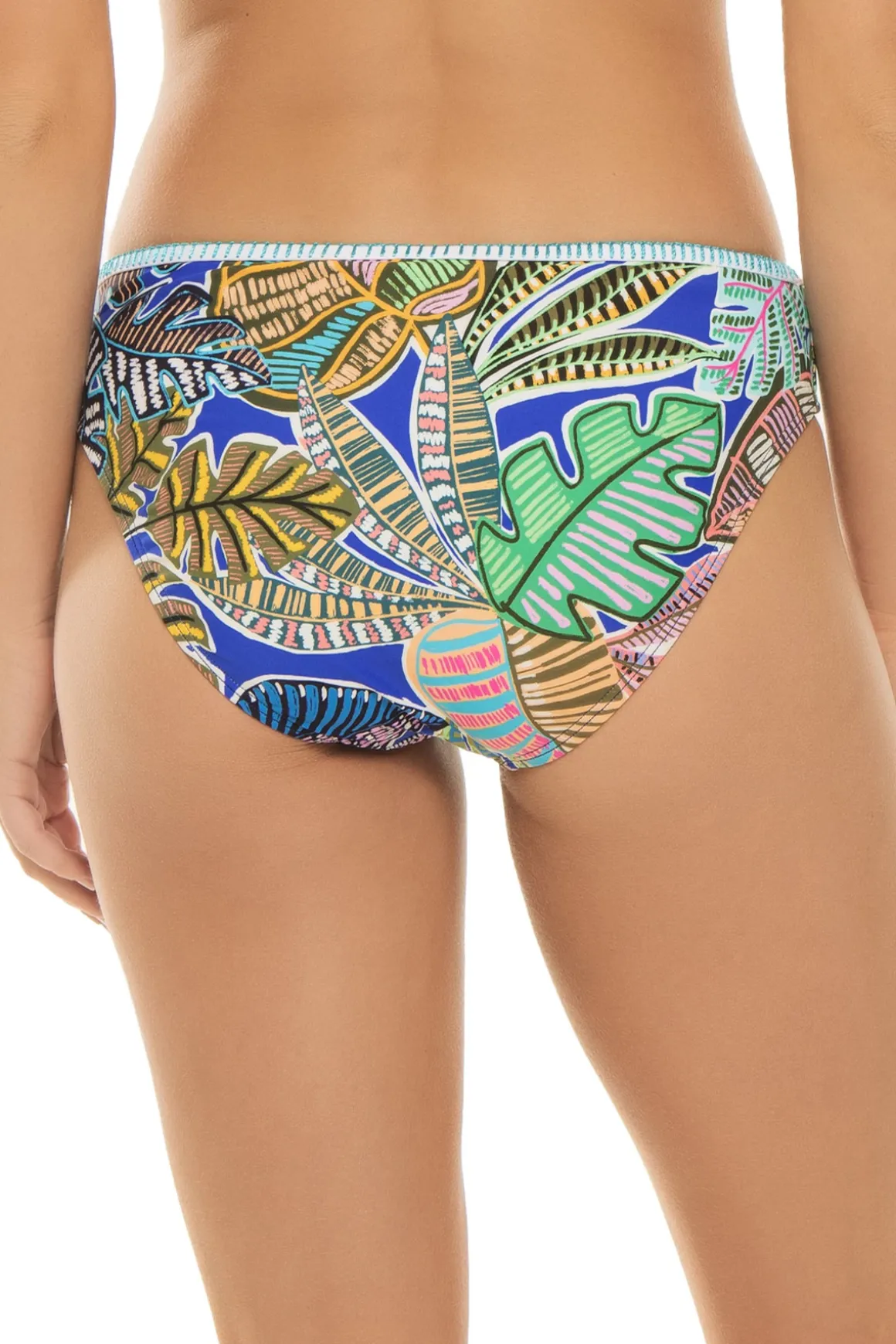 Neon Nights hipster bikini bottom features a vibrant tropical print with blanket stitched edging and offers moderate bottom coverage.