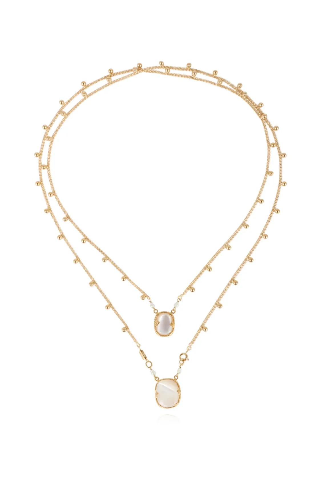 Scapulaire necklace is composed of beaded gilded metal chains with two white mother-of-pearl medallions. Can be worn as a double necklace or a long necklace.