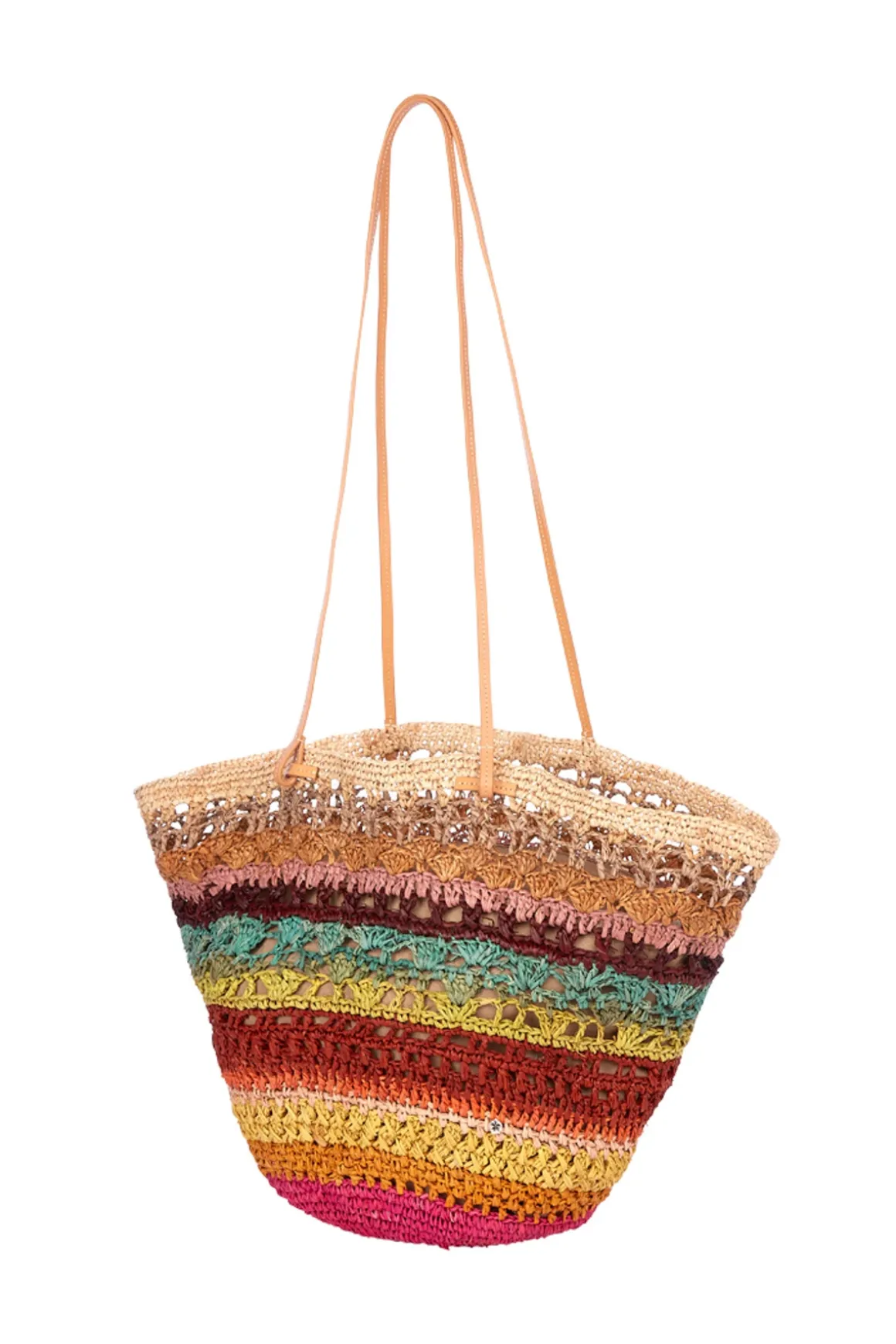 Paia tote bag made from woven raffia features a multi-colored stripe design and offers double leather top handles.