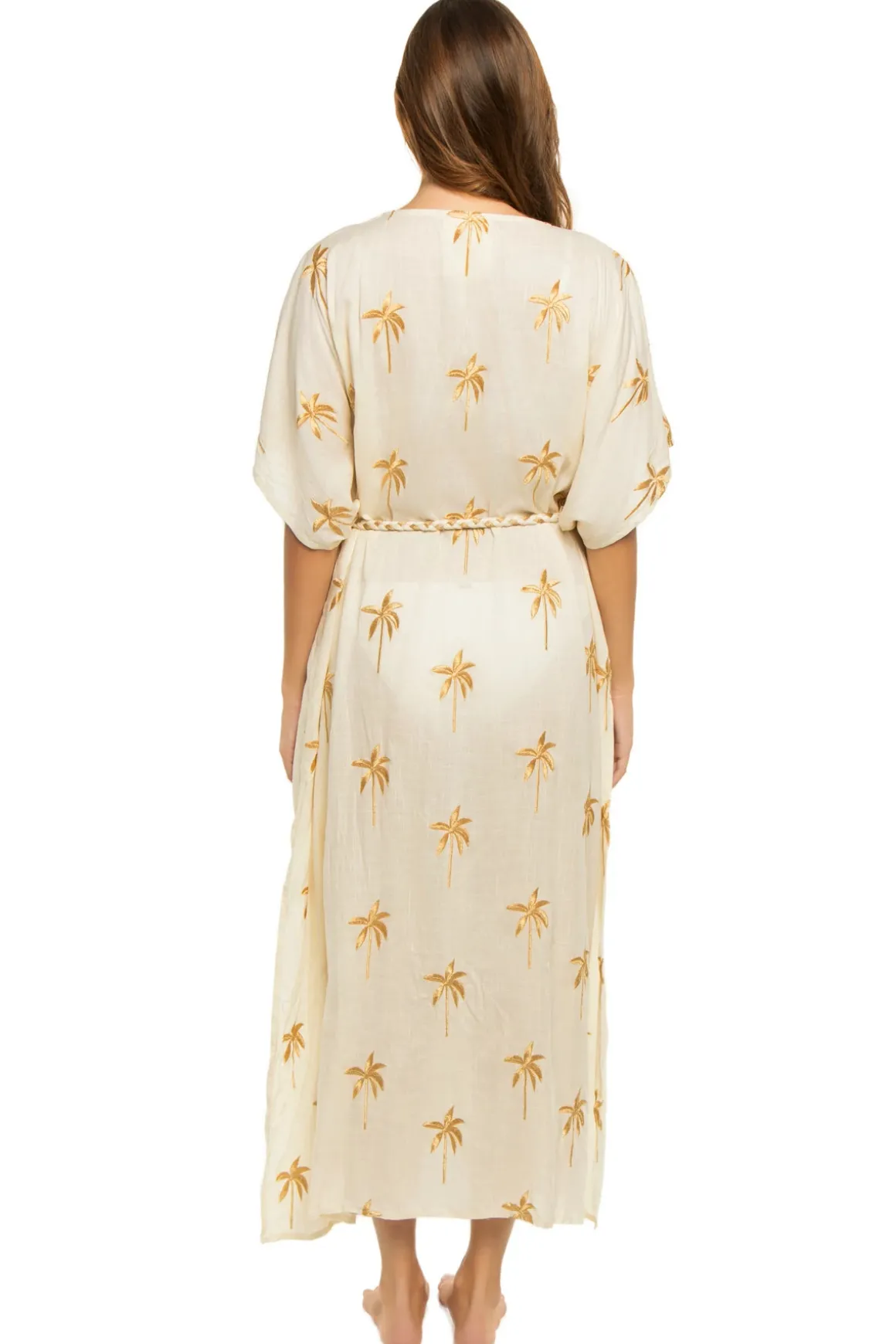 Caftan features palm details, short flutter sleeves, and an adjustable tie belt.