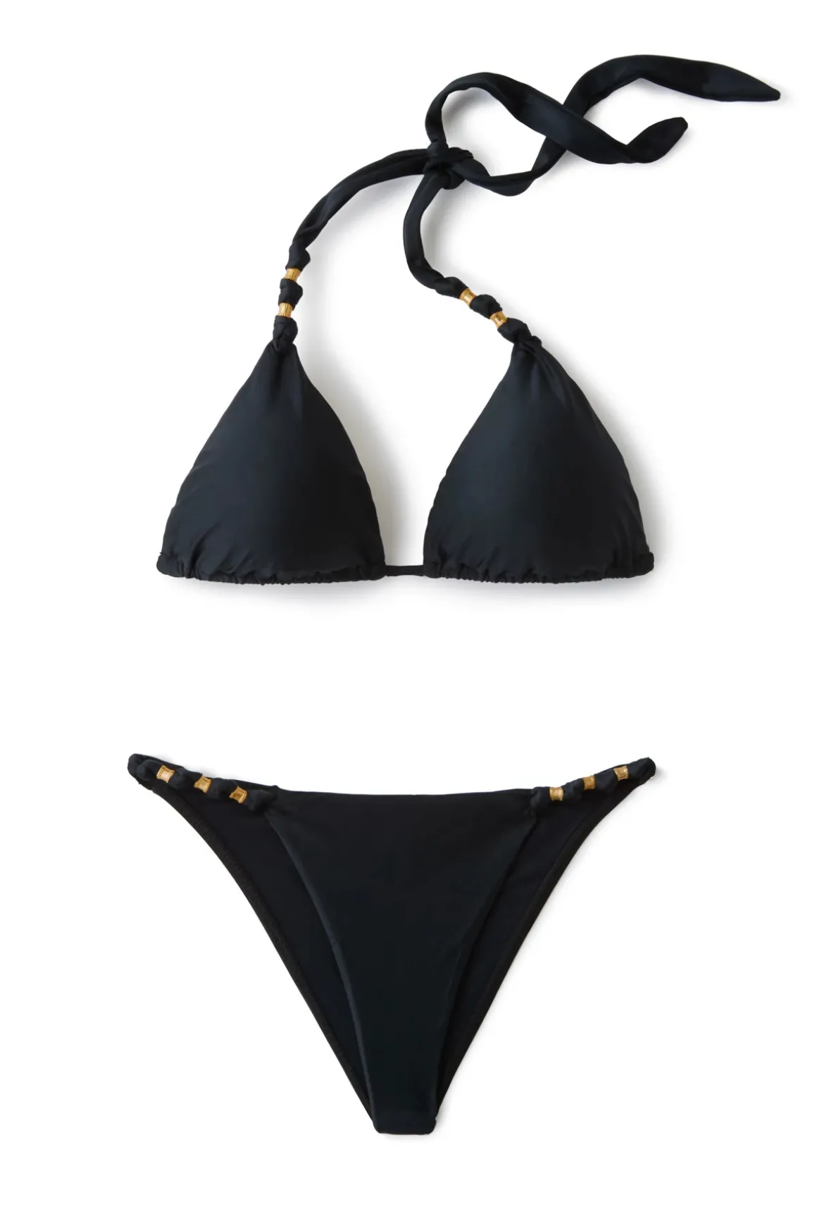 Paula hipster bikini bottom features hand-crafted knotted sides with 24k gold-plated ring accents and offers moderate coverage.