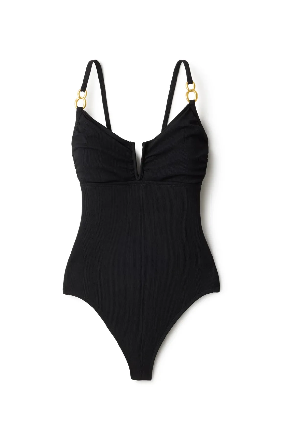 Textured one piece swimsuit features a v-wire front, shirring, and adjustable straps with chain-link details. Offers removable cups and moderate coverage.