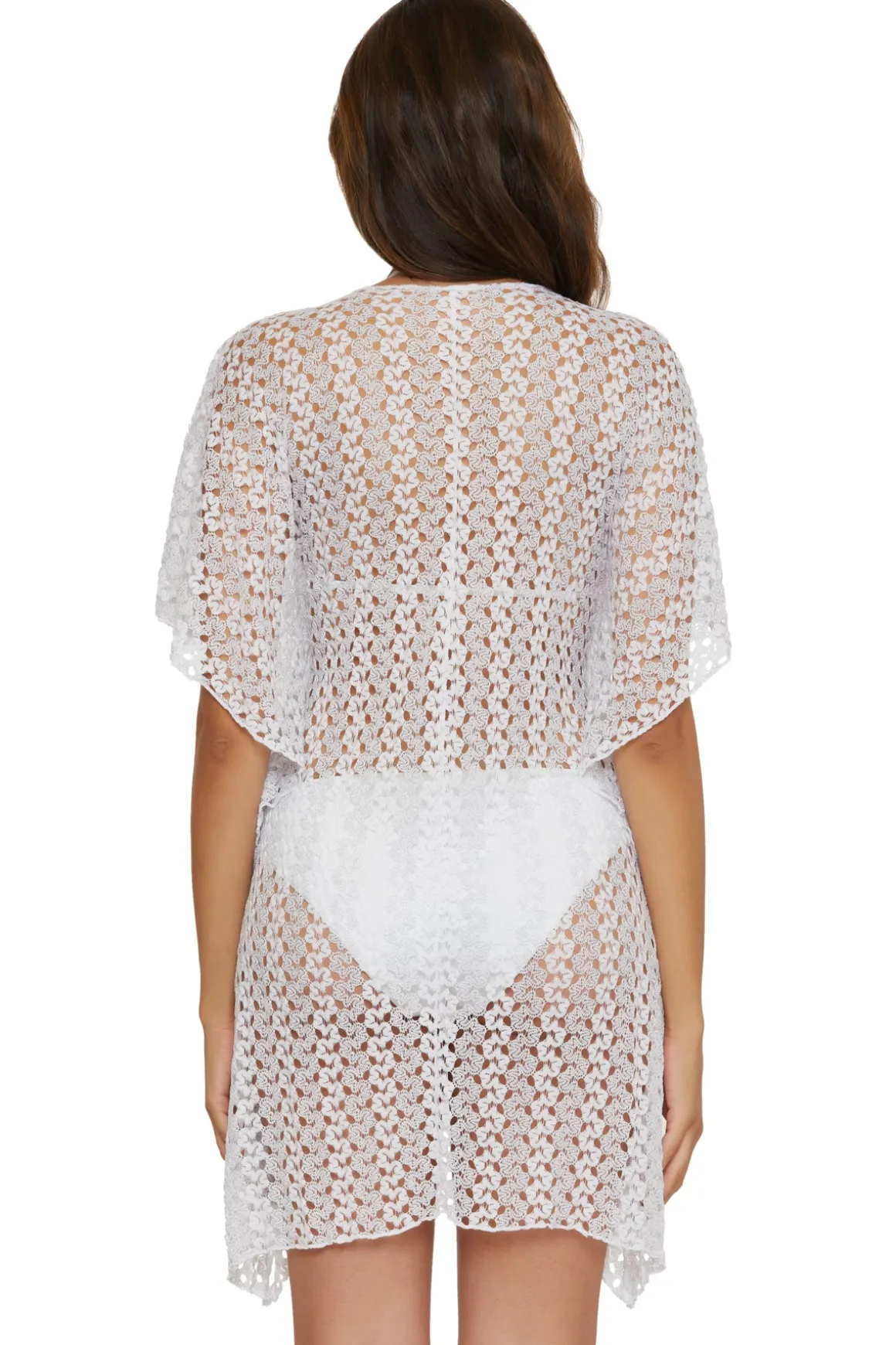 Platinum tunic features lace crochet fabric, 3/4 sleeves and a plunging neckline.