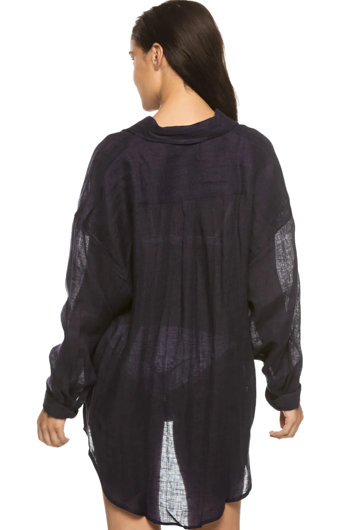 Floaty linen shirt dress – a chic, easy essential with drop sleeve, natural shell buttons. Perfect for any destination, on or off the beach.