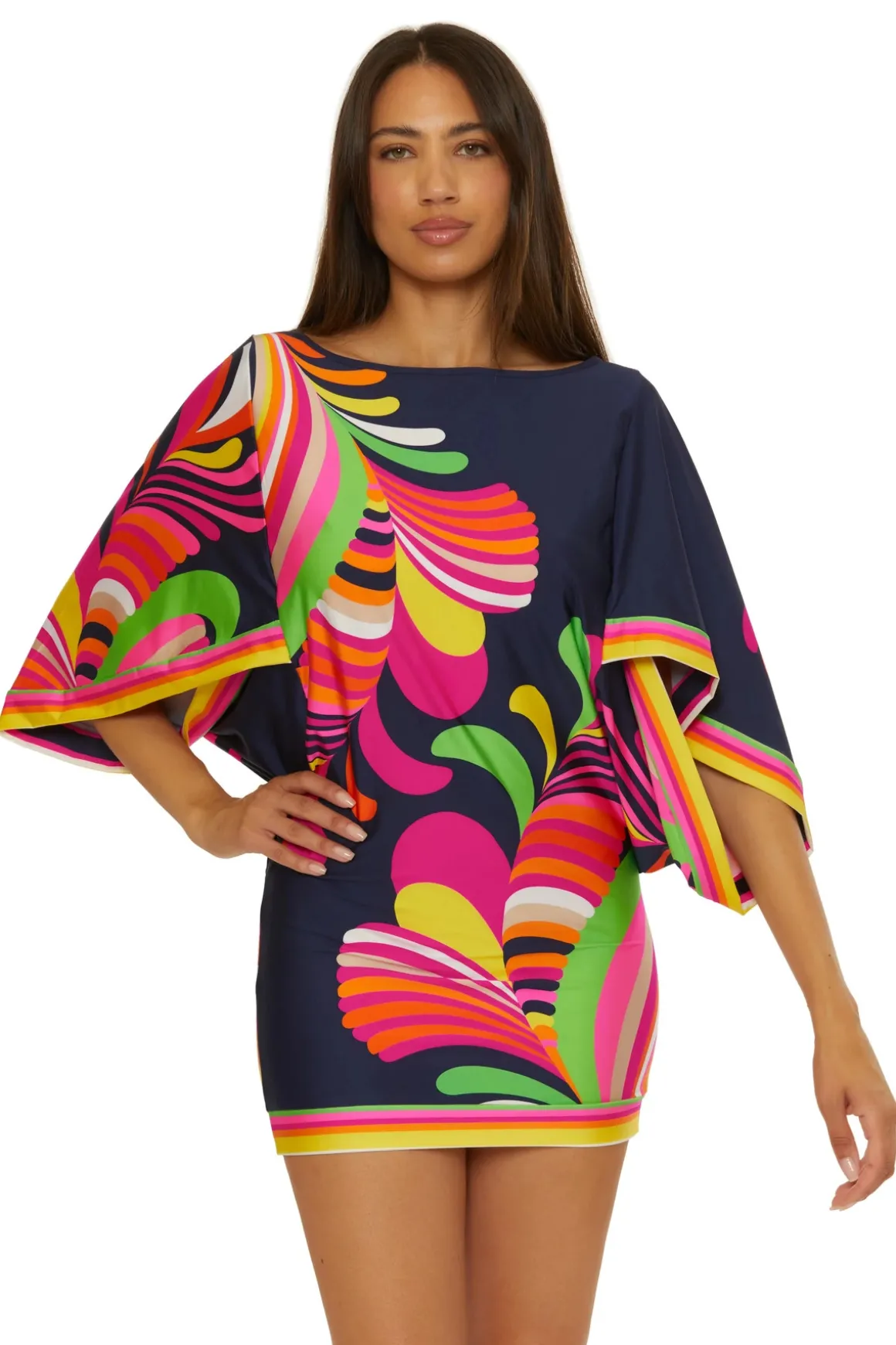Tunic can be worn as a swim cover up, a mini dress or as a top. Features 3/4 length wide sleeves and is fitted at hips.
