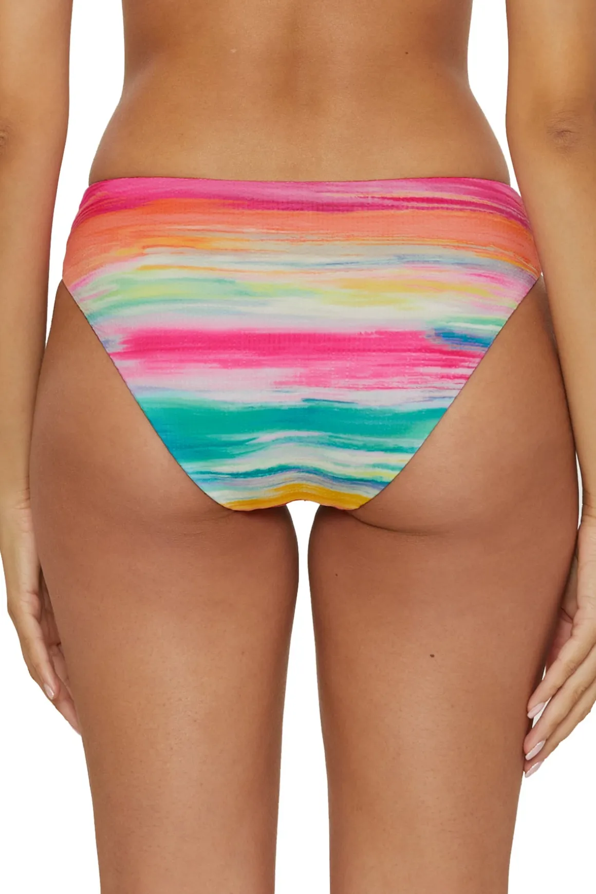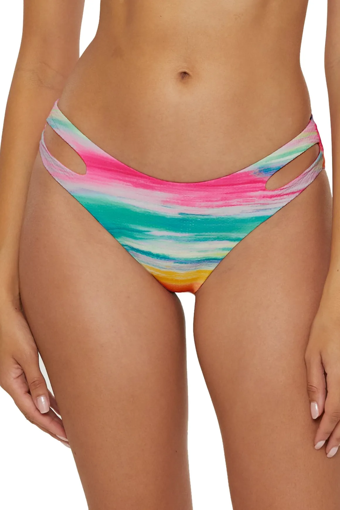 Presley hipster bikini bottom features a pucker texture and teardrop side cutouts. Offers moderate coverage.