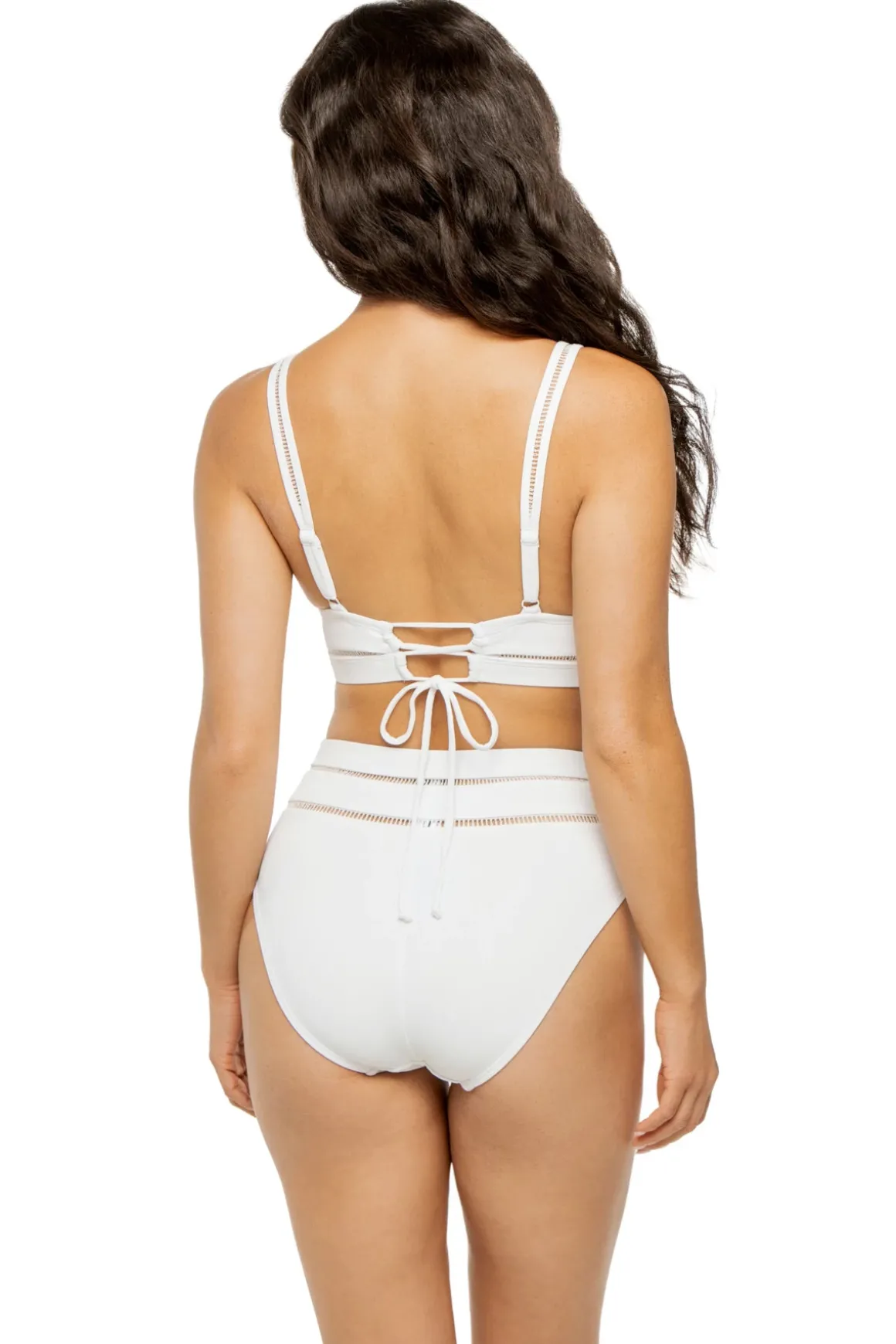 Quinn bikini top features ladder trim details and lace-up back tie closure.