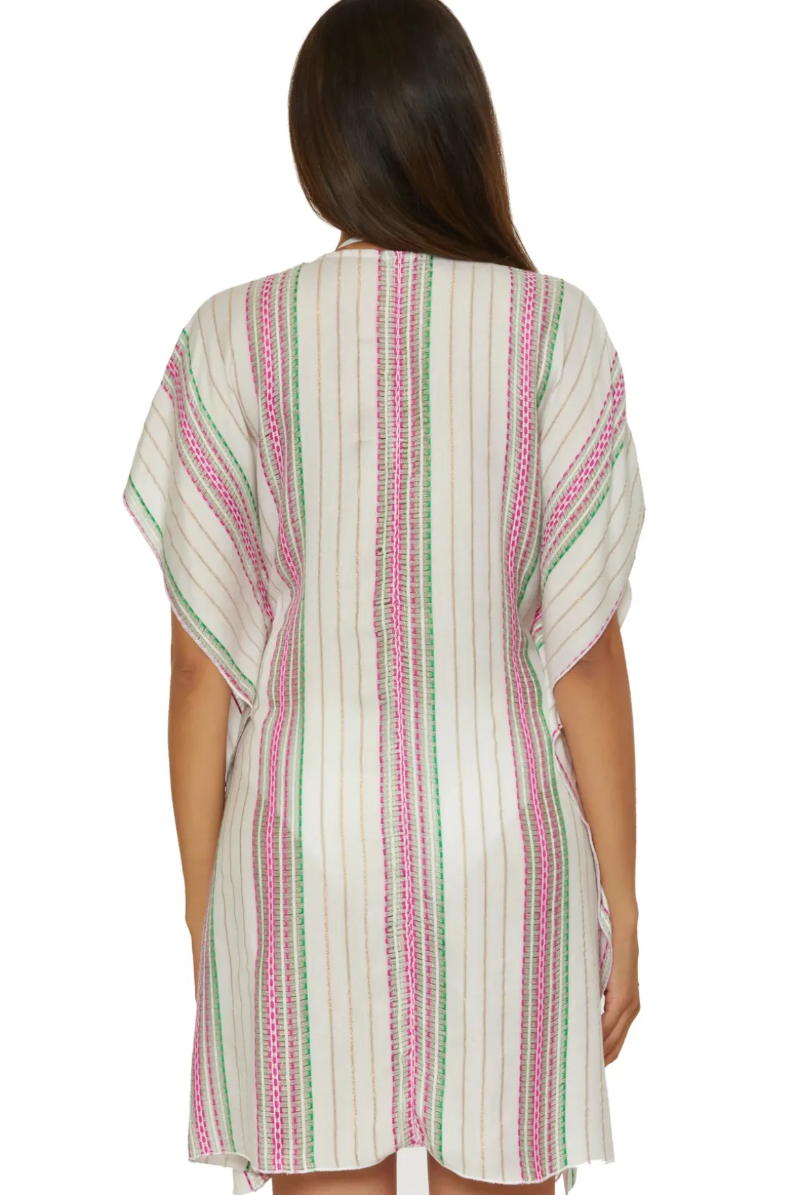 Radiance tunic features a striped design with metallic threads, plunging neckline, and batwing sleeves.