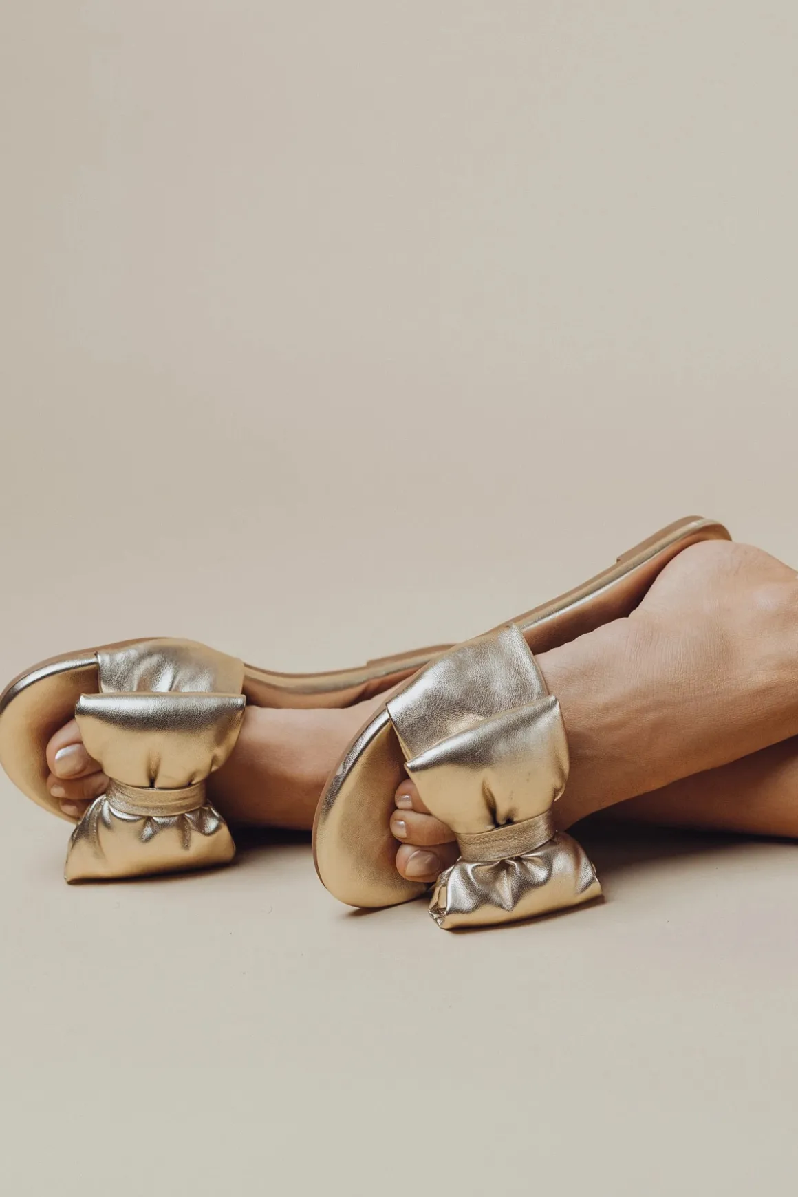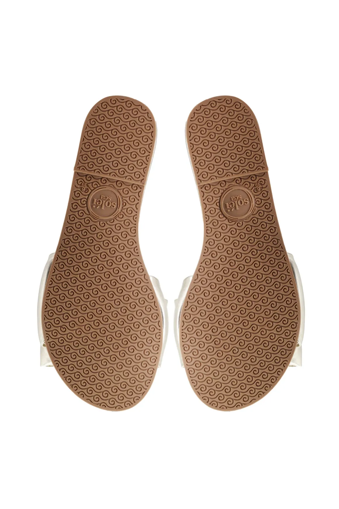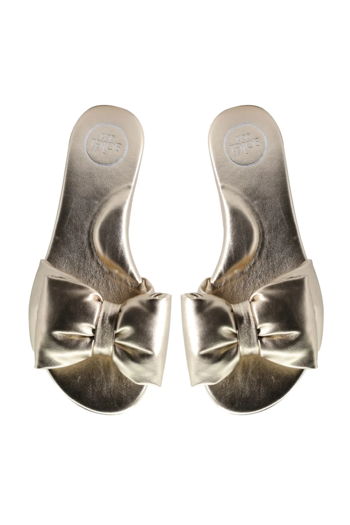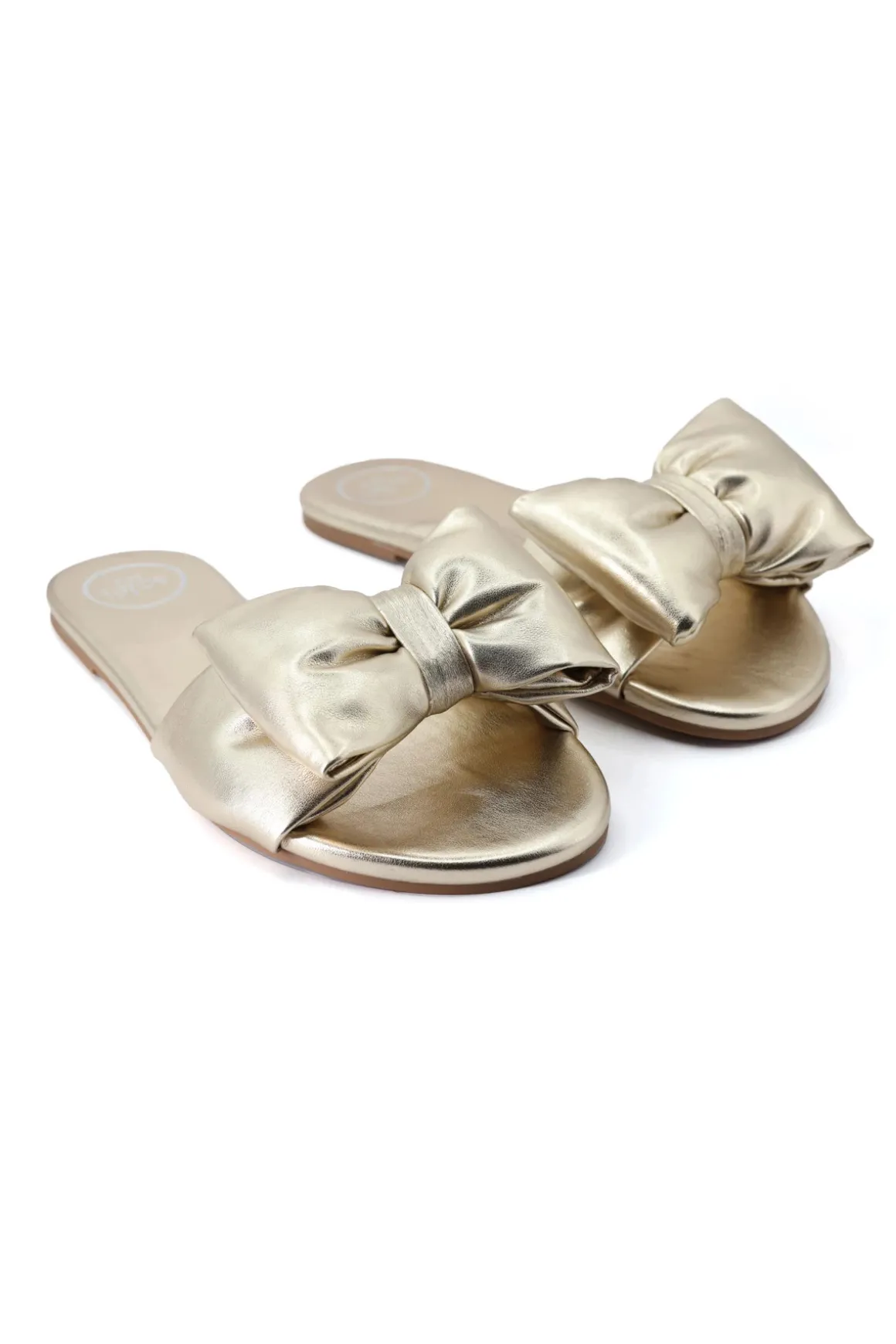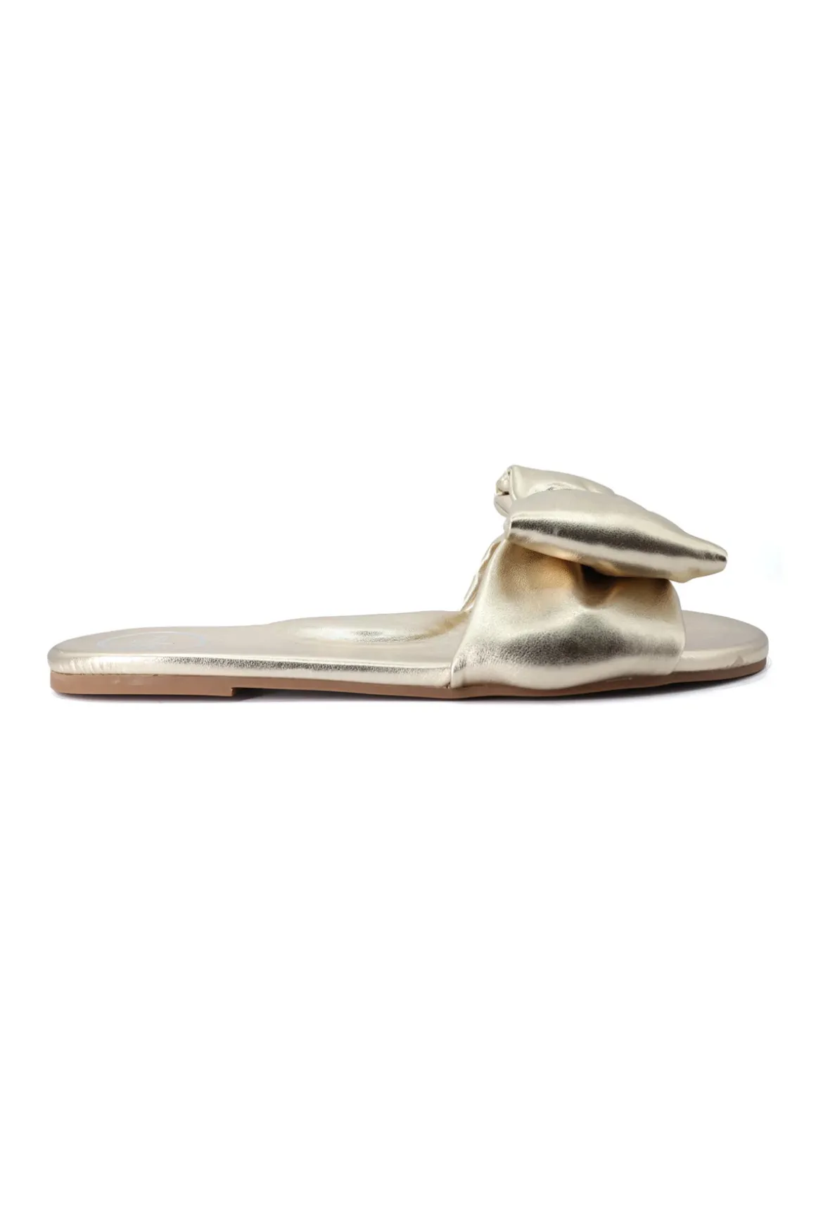 Rafie slide features a synthetic footbed and metallic bow detail.