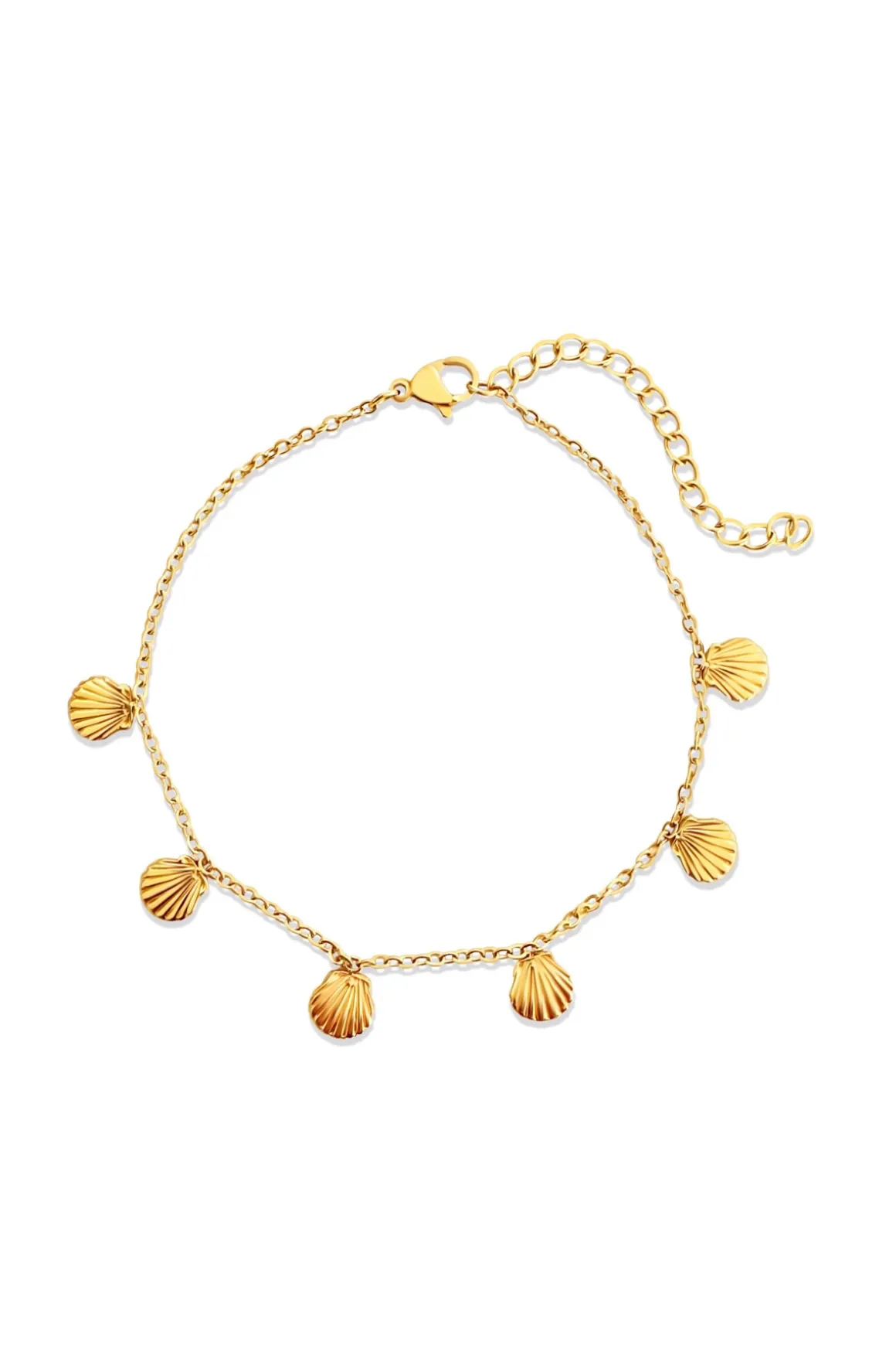 Regina shell anklet features hypoallergenic gold plated stainless steel that is water resistant and offers a lobster clasp closure.