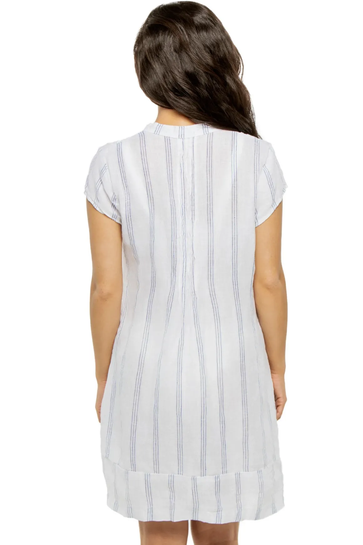 Regina tunic features delicate stripes, cap sleeves, and v-neckline.