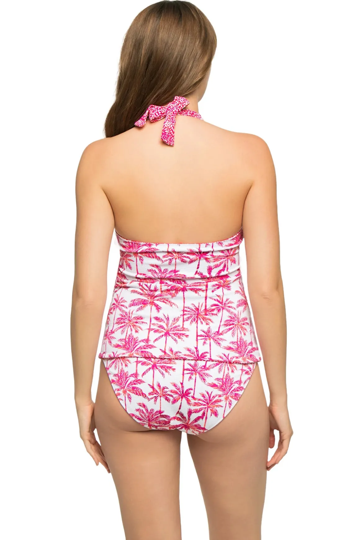Textured tankini top features a reversible print, a tie-front detail adorned with hammered gold charms, and an adjustable halter tie.