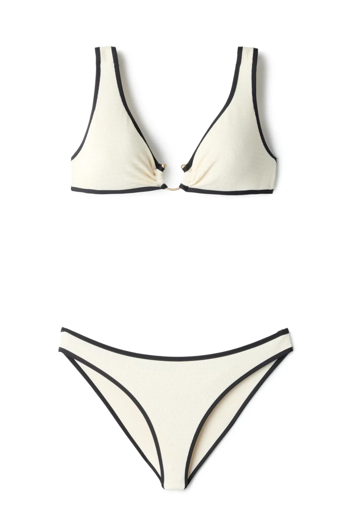 Bralette bikini top features textured fabric with a contrast trim and a center ring detail.