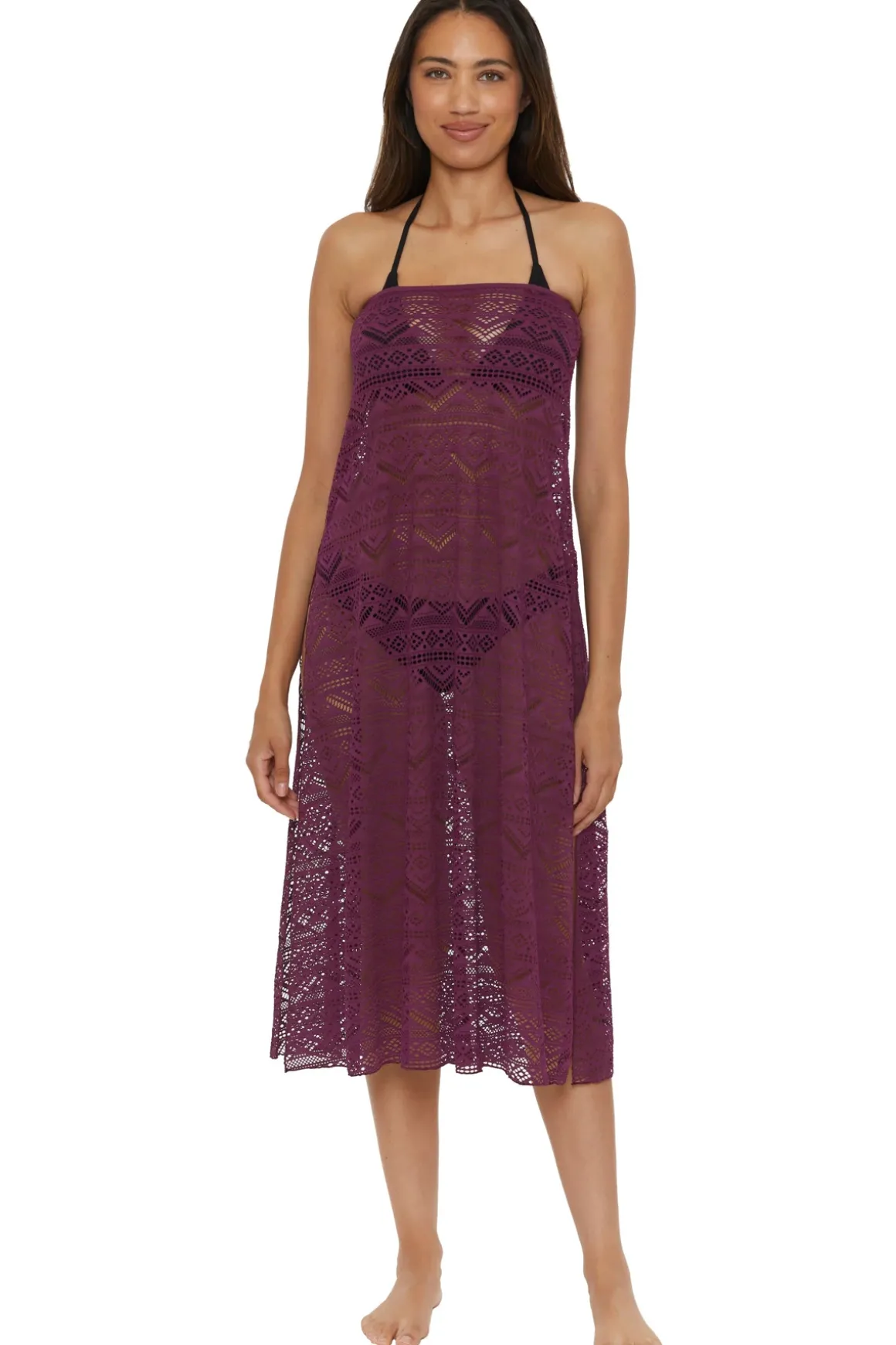 Rose maxi skirt features sheer crochet fabric. Offers an elastic waistband and side slits. Can be worn as a cover up skirt or a dress.