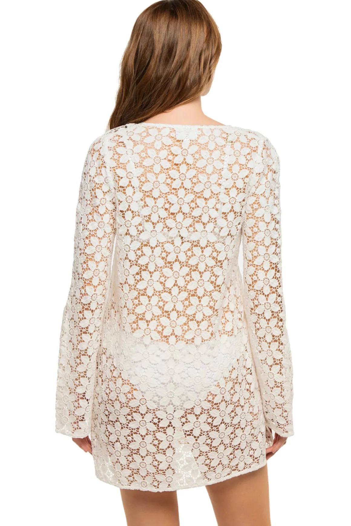 Rosie mini dress features delicate floral lace with charming tassel ends, a flattering v-neckline, and long sleeves.