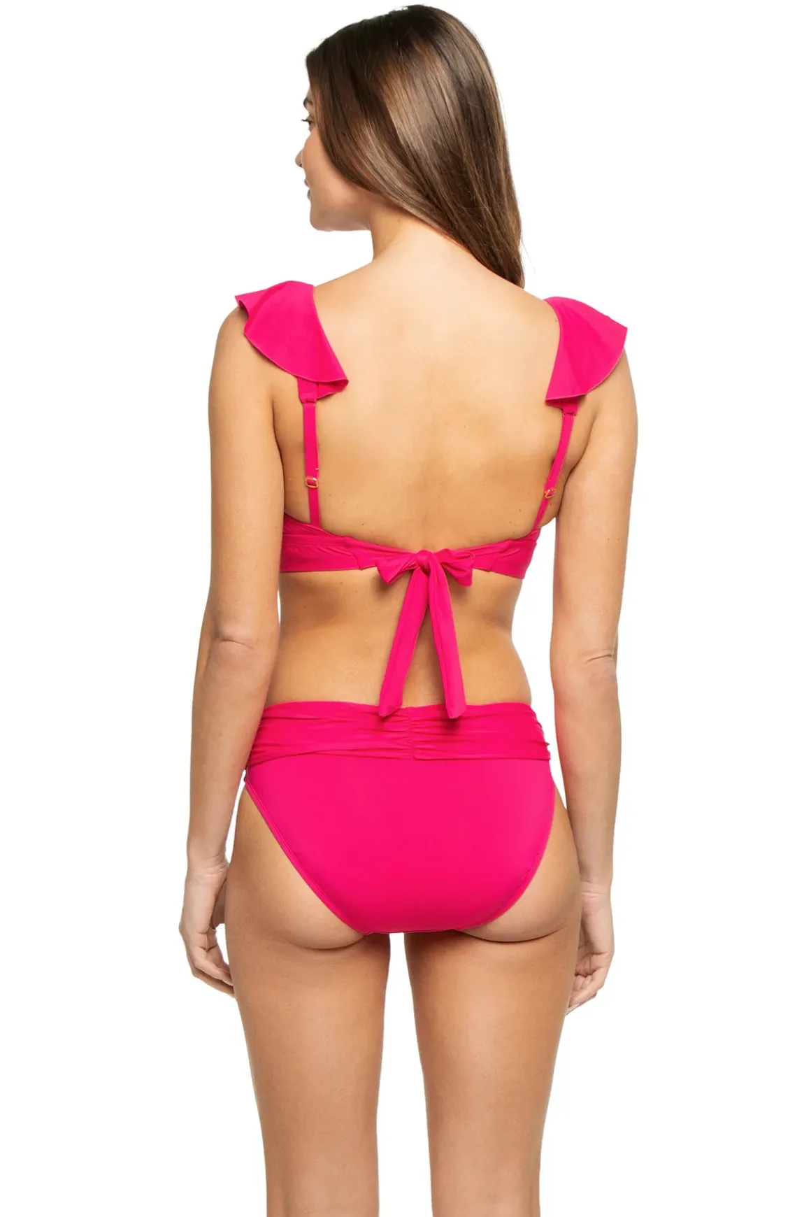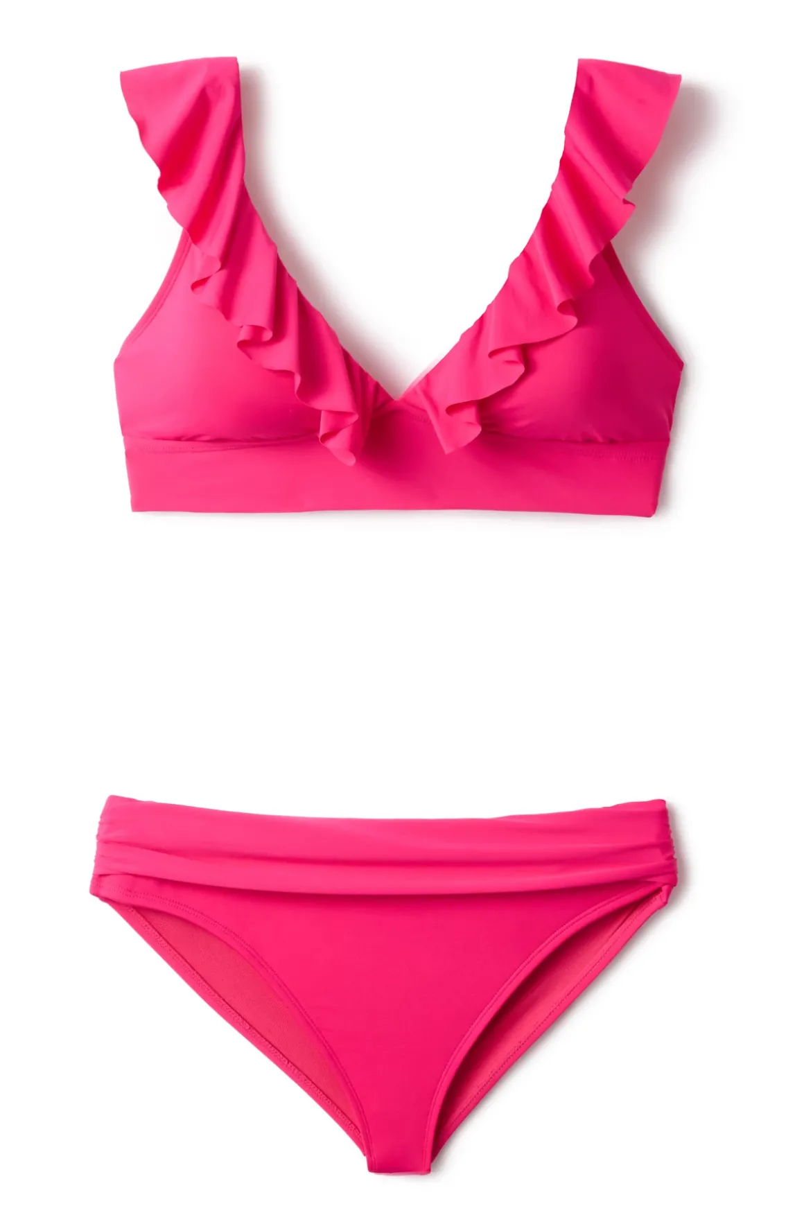 Bralette bikini top features ruffled v-neckline and offers removable soft cups, adjustable straps, and a tie back closure.