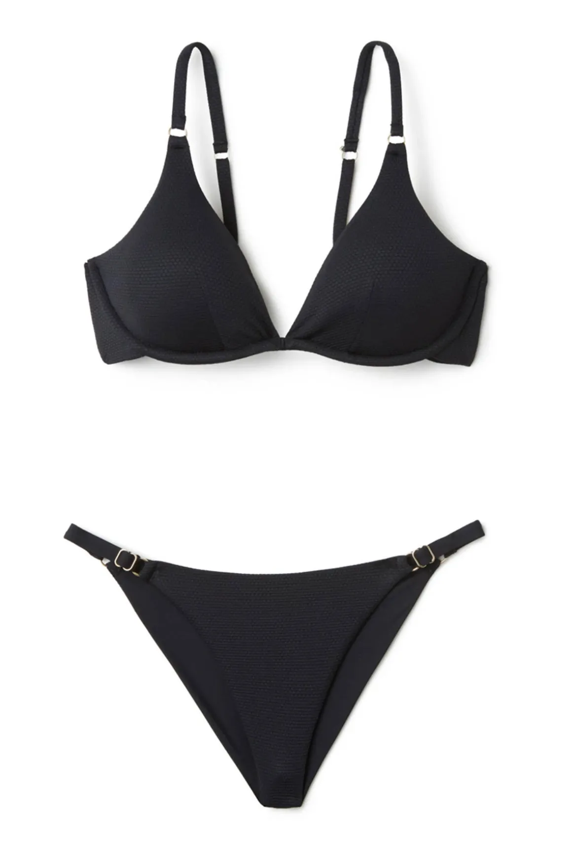 Ryan bikini top features a textured pique fabrication. Offers a personalized fit with removable soft cups, supportive underwire, adjustable back straps and hook back closure. Tailored to fit bra sizes 32C to 38E.