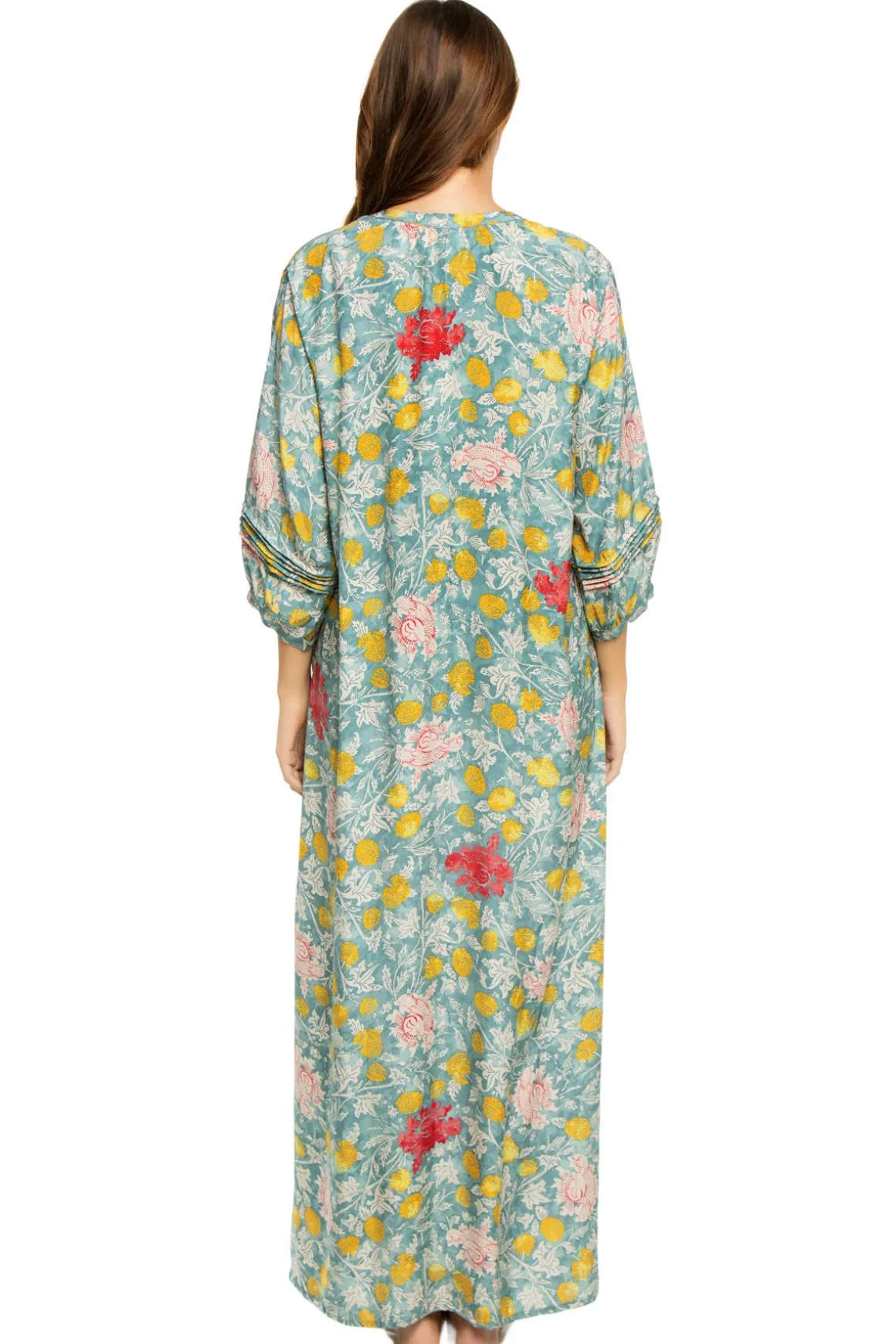 Sammie silk maxi dress showcases a delicate floral print and features elegant pleated details.
