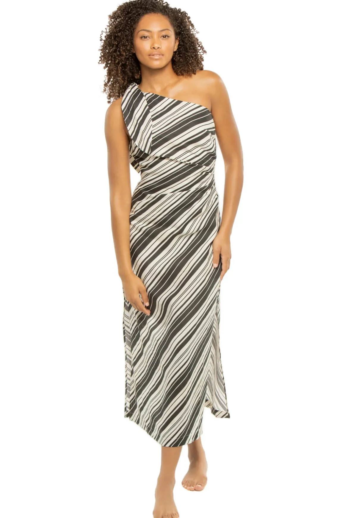 Sara midi dress features an asymmetrical neckline, adjustable tie at the shoulder, and ruched sides.
