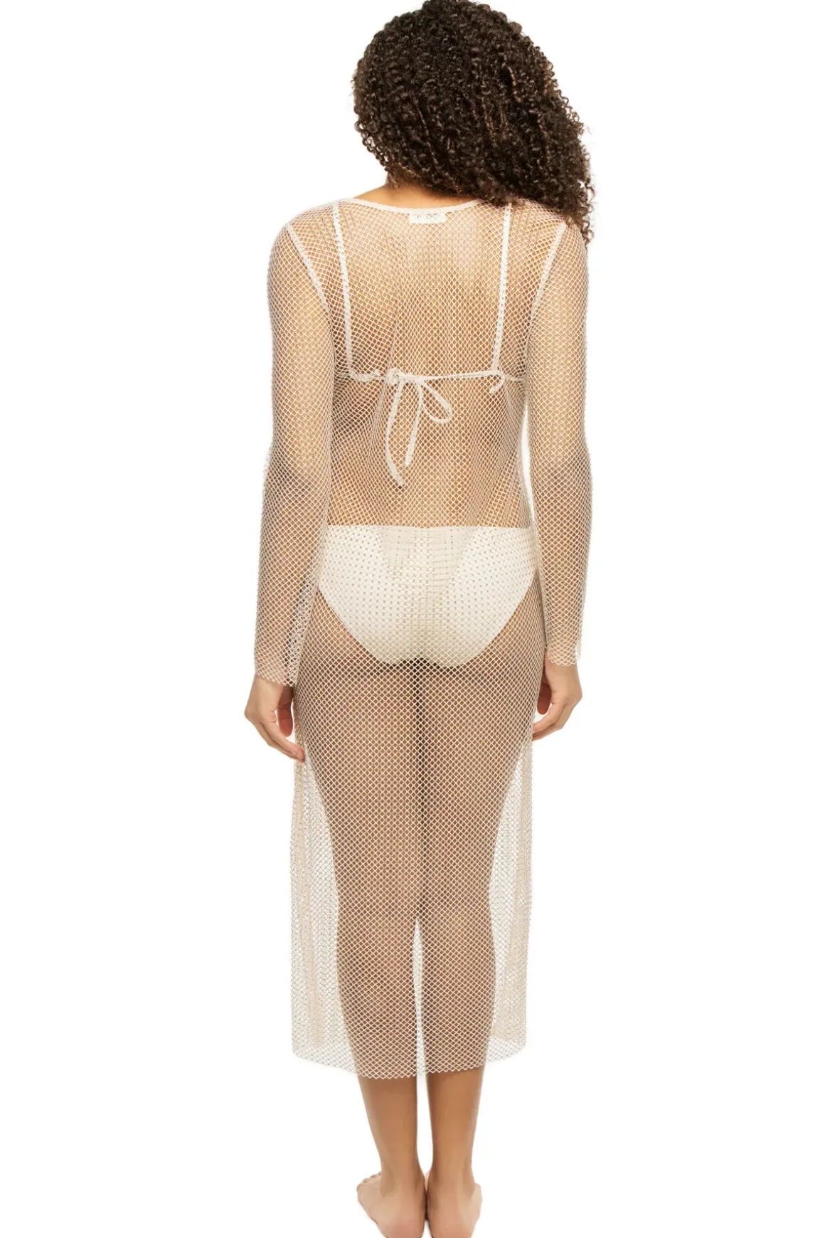 Sara mesh midi dress features aplunging neckline with a teardrop cutout.