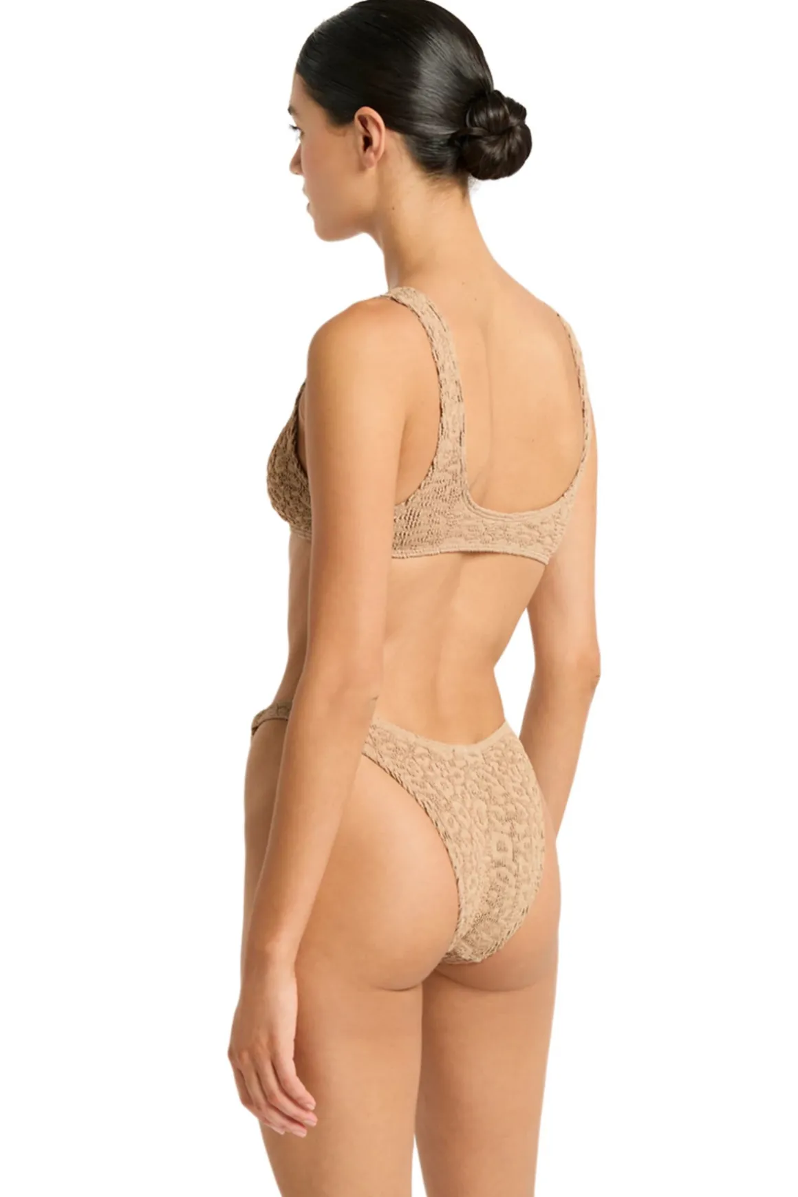 Scout bikini top features layering of multiple textures to create a leopard print design, center ring detail and wide shoulder straps for medium to full support.