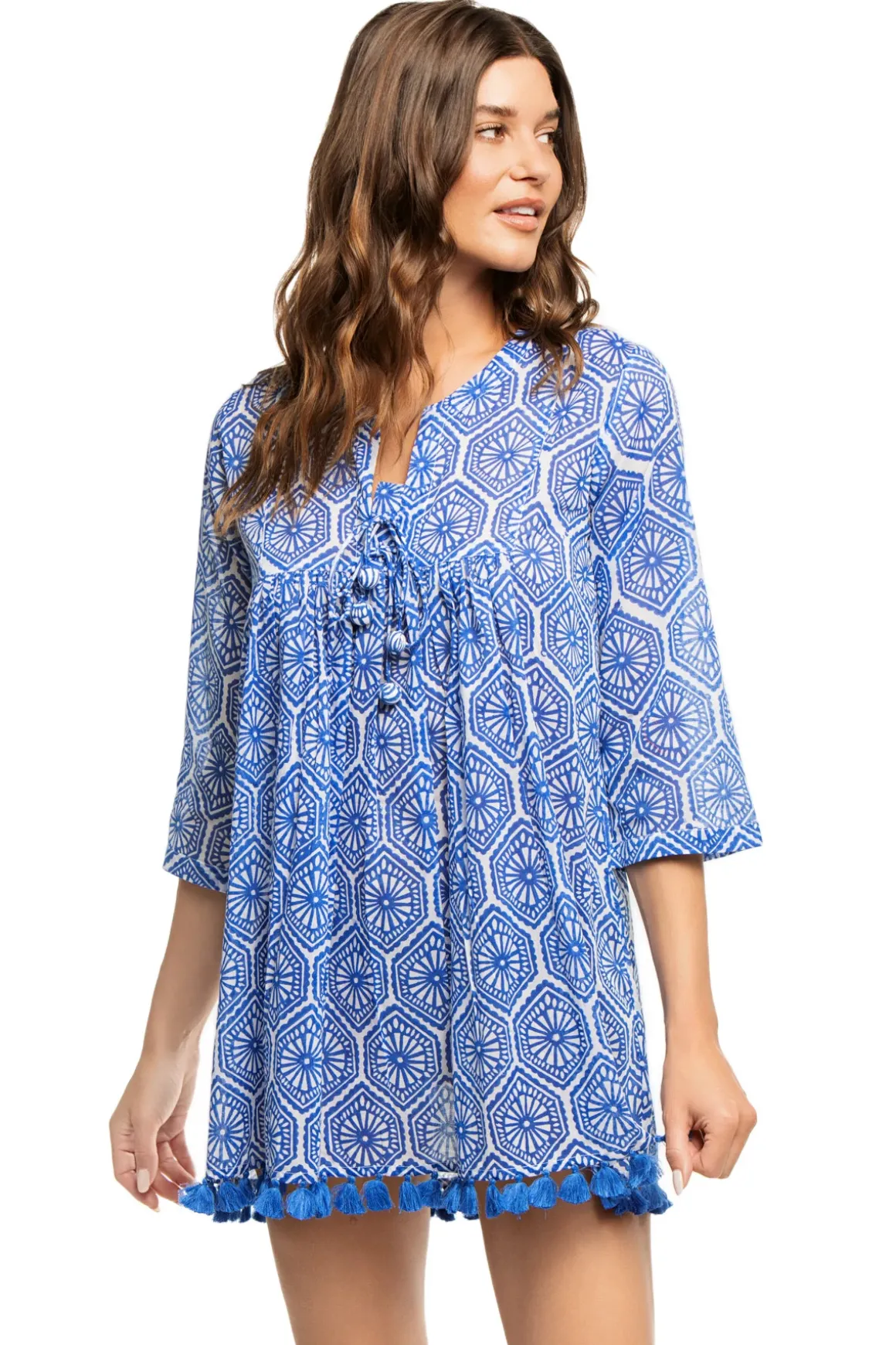 Seychelles Tunic features split lace up neckline, 3/4 length sleeves and tassel hem.