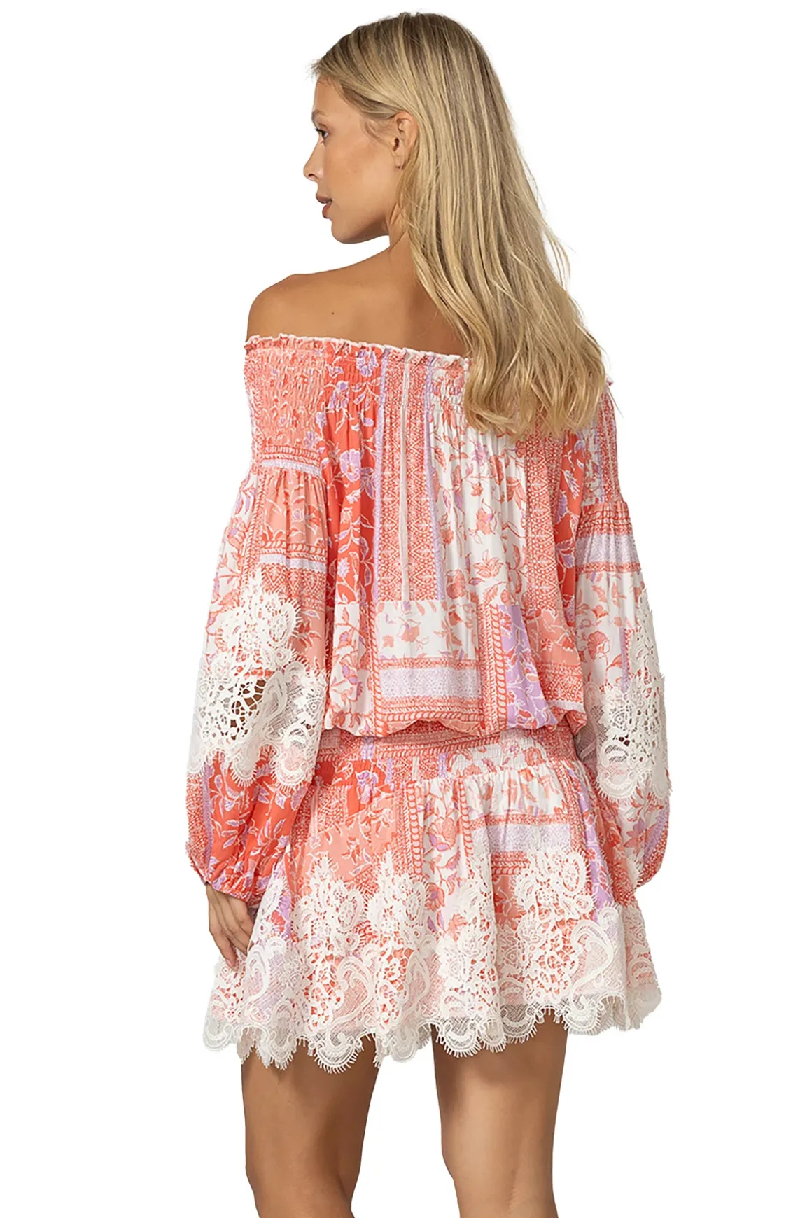Shania mini dress features an off-shoulder design, long sleeves, smocked waistband, and delicate lace details.