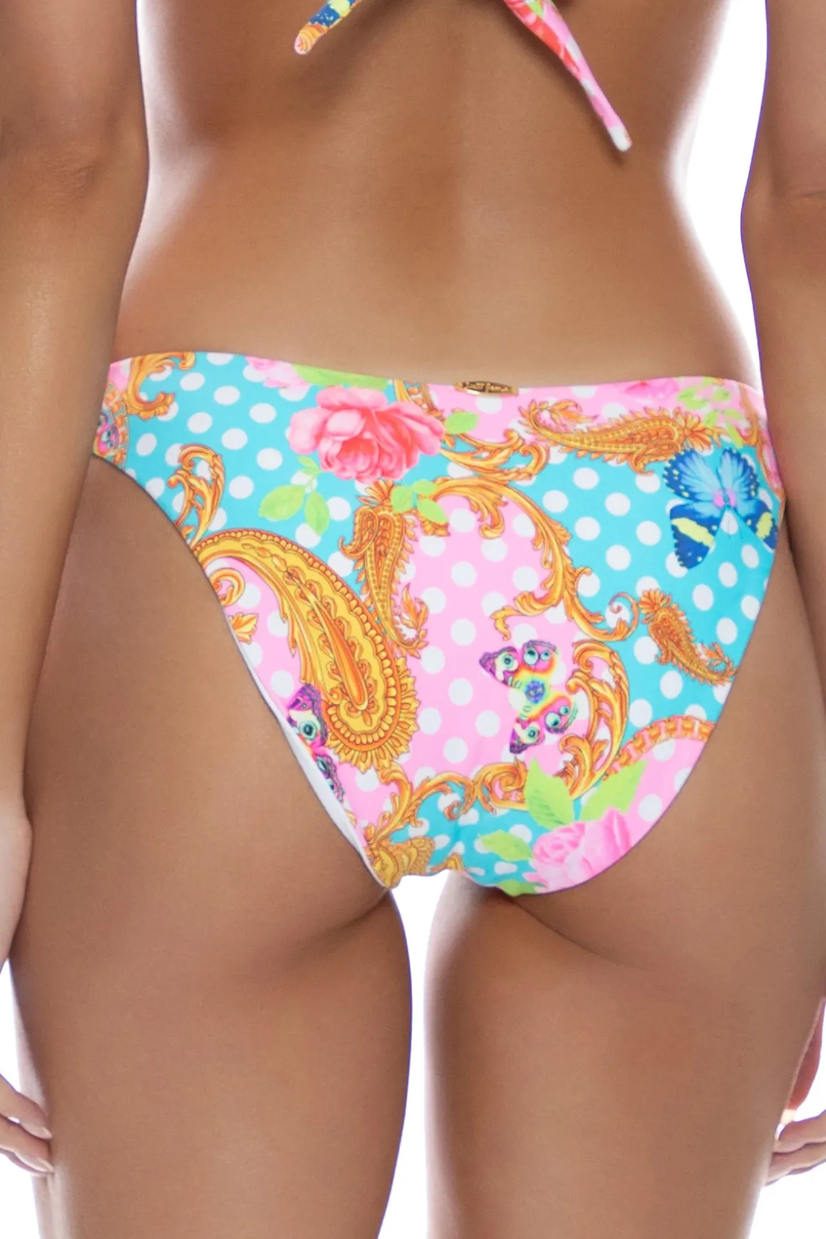 Hipster bikini bottom features v-front, ring details, and offers moderate coverage.